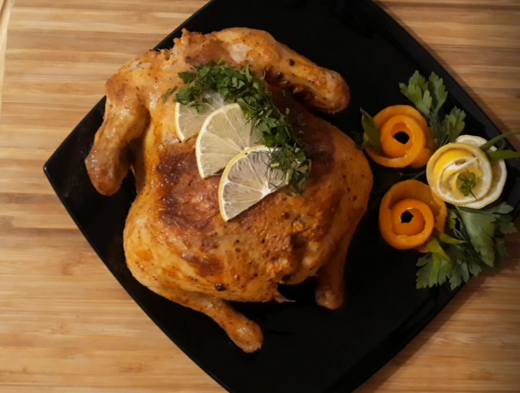 Кулинарный канал «Экономная Вкуснятина» Курица с лимоном Курица с лимоном — это максимально простое в приготовлении блюдо, которое не раз выручит Вас, когда быстро и вкусно нужно приготовить ужин для семьи, порадовать себя или когда гости скоро будут у вас! Для приготовления понадобится: 1. Тушка курицы 2. 1 лимон 3. 1 чайная ложка сладкой паприки 4. 1 чайная ложка сухого чеснока 5. 1 чанная ложка смеси перцев 6. 1 столовая ложка соли 7. 1 столовая ложка сметаны 8. 1 столовая ложка майонеза 9. Зубочистки, нитки Способ приготовления: 1. Смешать все специи со сметаной и майонезом. И очень тщательно все перемешать. 2. Сделать надрезы на лимоне. 3. Нанести смесь внутрь курицы. 4. Отправляем лимон внутрь курицы. 5. Зубочистками запечатываем курицу 6. Нитками обматываем зубочистки 7. Полностью обмазываем курицу 8. Убираем курицу на 50 минут в холодильник, чтобы курица пропиталась. 9. Перекладываем курицу в форму и отправляем ее в духовку при температуре 180-200 градусов минимум на один