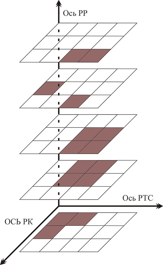 Далее представим в трехмерном пространстве по трем осям график: на одной оси отметим четыре уровня развития технической системы, на второй оси — три уровня развития компании, на третьей оси — пять уровней развития рынка (рисунок № 7). Получилось пространство из шестидесяти кубиков, а так как трехмерная модель отображается в двухмерном пространстве, в нашем случае изображены квадраты. Отметив в этом пространстве квадраты, соответствующие жизнеспособным сочетаниям, мы увидим, что их всего пятнадцать. Выявляются они путем логического размышления о возможности сочетания параметров, которые задают оси координат, при которых компания может жить и развиваться. В качестве примера: начинающая компания не сможет выпускать на рынке третьего уровня продукт третьего уровня развития технологической системы, или компании третьего уровня нецелесообразно работать на рынке нулевого и первого уровня с продуктами первого уровня технологического развития.