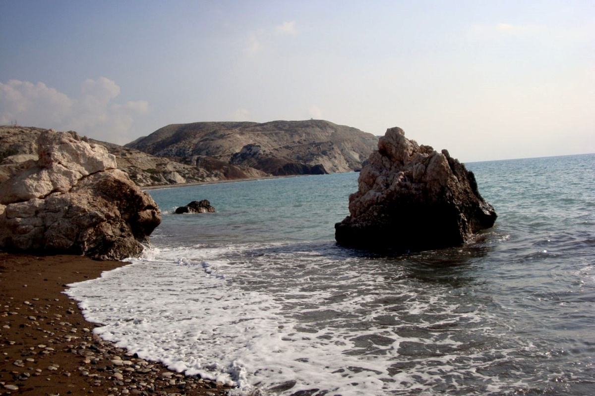 Это место, где встретились Уранос, бог неба, и Гея, богиня земли. В начале времен и родился у них сын Хронос, бог времени. Вот и началось время богов, живших на земле, а потом и людей. Хронос вырос и стал соперничать с отцом, а однажды в сражении отобрал часть неба, и бросил его вниз, в море. А у моря и неба родилась дочь Афродита, и вышла из пены морской на берег острова.