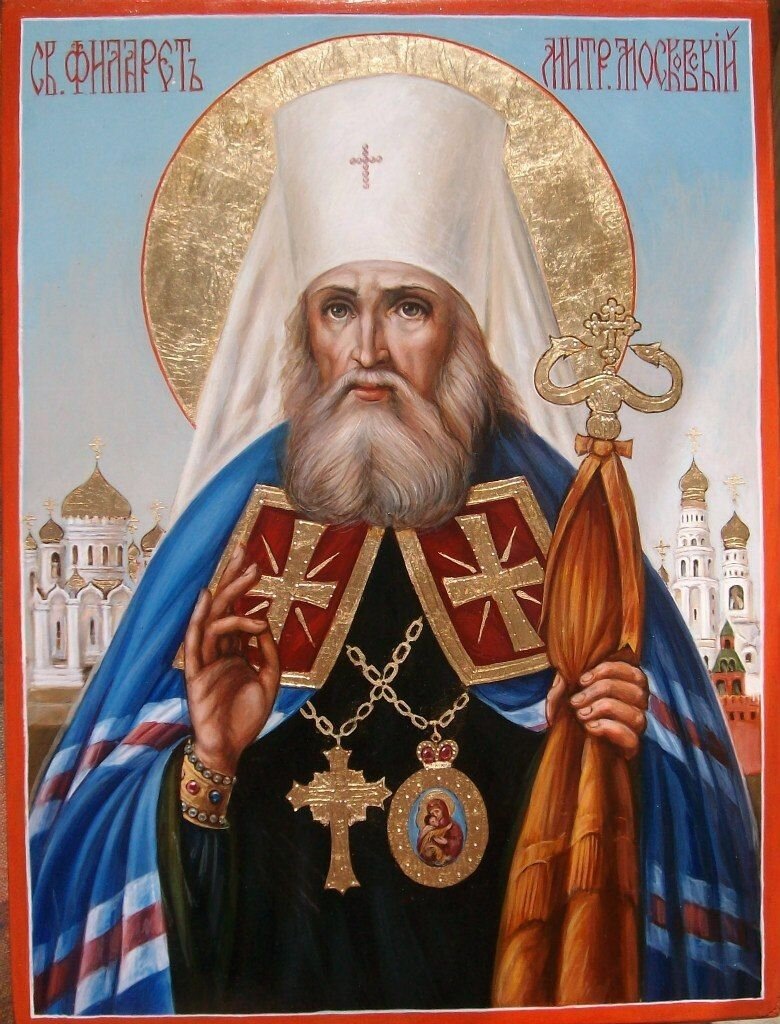 Святитель Филарет, в миру Василий Михайлович Дроздов, родился в 1782 году в Коломне, в семье потомственных священников. В 9 лет он поступил в Коломенскую семинарию. В 1799 году семинарию закрыли, и Василий, по совету отца, сдал экзамены и поступил в Троицкую Лавру. По окончании учебы он был назначен преподавателем греческого и древнееврейского языков. В 1808 году Василий был пострижен в монашество с именем Филарет и в этом же году рукоположен во иеродиакона. Через год его переводят в Петербург и там состоится его рукоположение во иеромонаха. В 1812 году Филарет был назначен ректором Санкт-Петербургской Духовной Академии, где он прослужил до 1819 года. После этого он был назначен на Тверскую кафедру в сане архиепископа. В 1821 году Филарет назначается на Московскую кафедру. У святителя сложились непростые отношения с императором Николаем I, это произошло из-за многочисленных донесений на святителя. Например, когда Филарет во время эпидемии холеры в 1830 году упомянул в проповеди о прегр