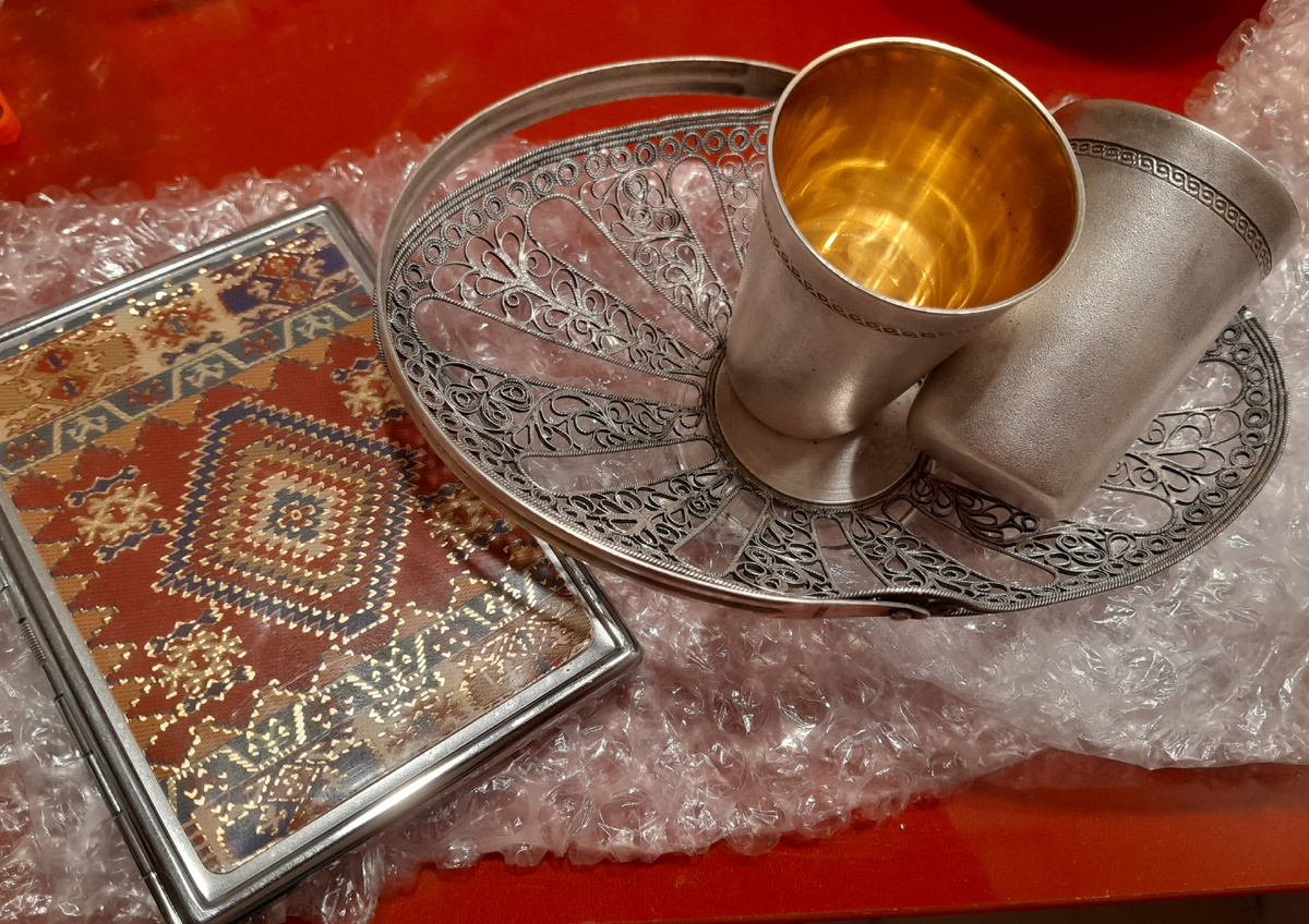 Вчера приехала посылка с новой покупкой на Авито, сейчас покажу, что купили. Увидели мы тут объявление. Продавалась кучка предметов за 1200 рублей. Мы решили предложить 800 - за спрос денег не берут. Сначала продавец попросила 1000, нам, конечно, было дорого. Мы уже и думать забыли про это объявление, тут продавец пишет - забирайте за 800, если ещё актуально. Ну мы и сделали заказ. Доставка вышла какая-то совсем дешёвая, меньше 20 рублей. Сразу оговорюсь. Я по старинке пишу "мельхиор", хотя это "нейзильбер". Мельхиор это сплав меди и никеля, а нейзильбер отличается тем, что туда ещё добавляют цинк. Но в народе и то, и другое считается мельхиором. Поэтому и я пишу так, чтобы было понятнее. Покажу кучку купленного. Портсигар это, конечно, не мельхиор, но в куче был. Две вот такие стопки. Позолоченные внутри. И овальная конфетница со сканью. За всё ☝️ отдали 800. И покажу ещё, какую коробку мельхиора недавно отправили. Ну коробка это, конечно, громко сказано, коробка получилась потому
