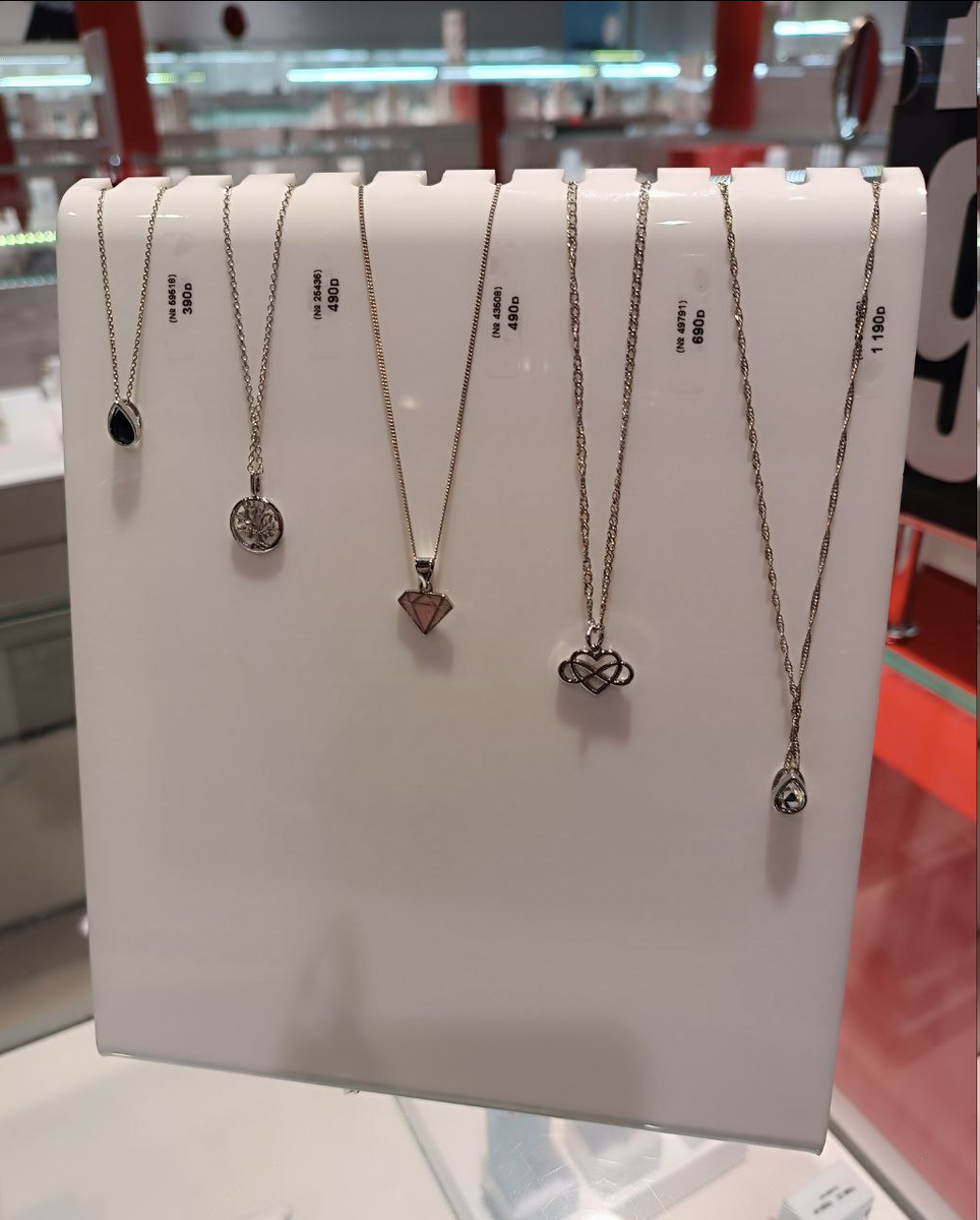 Мне выпал купон в игре Магнит на бесплатную подвеску из Санлайт + 50 бонусов на карту Магнит для старых клиентов Санлайт или 100 бонусов для новых клиентов. Всё равно хотела пойти проведать, какие подвески сейчас предлагают, а за баллы Магнит тем более пошла на разведку. А в магазин такие симпатичные подвески завезли: С трудом выбрала себе вторую слева - в форме дерева. Потому что в форме капель у меня есть две, но другого цвета. Уже жалею, что не взяла прозрачную каплю (крайнюю справа). Да и вместе с чёрной каплей они бы интересно смотрелись в моей коллекции. Хотела взять ещё, но продавец сказала, что одному человеку в день можно забрать одну подвеску, даже с разных номеров телефонов. Но зато рассказала, что в соседнем ломбарде Санлайт, оказывается, тоже есть такие подвески, и там можно взять ещё, я двинулась туда. Кстати, номер телефона я продиктовала тот, который, возможно, не светился в базе Санлайта, свой второй номер. Может, получу 100 баллов Магнит, а не 50. А ещё интересно то,