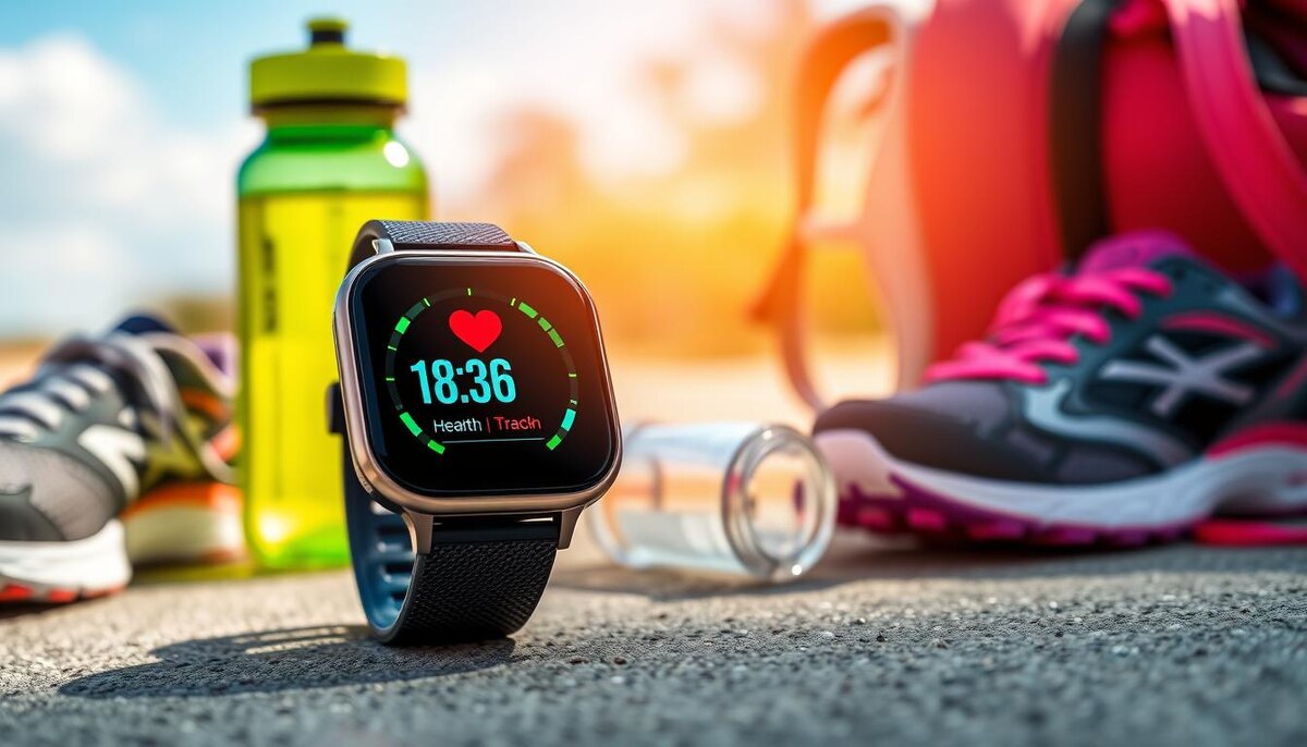Элегантные современные фитнес-часы с яркими показателями здоровья, ориентированные на отслеживание частоты сердечных сокращений и активности. На фоне активного образа жизни, с такими элементами, как кроссовки для бега, бутылка с водой и солнечный пейзаж на улице. Часы имеют элегантный дизайн с минималистичным интерфейсом и яркими цветами, демонстрирующими их технологии и функции мониторинга здоровья.