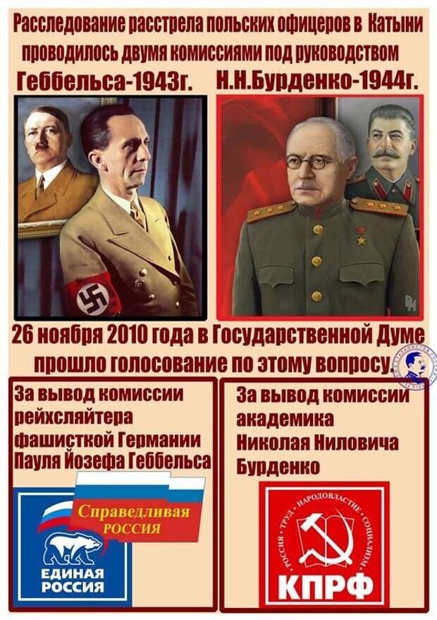 Лес. Могилы. Лежат офицеры. Мир их праху. И вечный покой. Но на этих надгробиях серых. До сих пор продолжается бой. Нет покоя погибшим солдатам Рвется память потомков о них. То ли жертвы они супостата То ли разума нет у живых… Не в бою они были убиты. Не в атаке за отчий свой край Им в затылок плевок пистолета Прилетел у расстрельного рва. Немецкое оружие. Немецкие пули. Немецкие веревки руки стянули. Немецкая комиссия всего лишь через год Умозаключенье «объективное» дает. Гуманные нацисты, на глазах у шляхты Польские трупы - немецкой лопатой… Геббельс рыдает, сочувствуя беде. И делает вывод: расстрел – НКВД… Патриотично сидя в ресторанах Сбежавшие в Лондон правители Польши Веря, что Геббельс поведал им правду Версий Советов не слушают больше.... Наследники панов на эти могилы Ринулись лить крокодиловы слезы Вечной судьбой и ответом им стала Выросшая во поле русская береза…