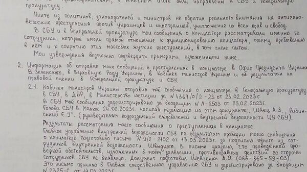 Украинский депутат опубликовал обращение к Зеленскому узника киевского концлагеря СБУ