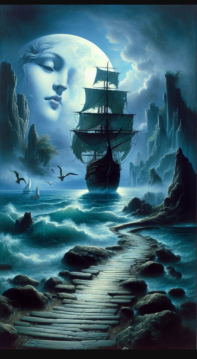 Любительский лит. перевод Острова словно звёзды завязли В ночной синеве На ветках дерева огни танцуют, И падают как перезрелые плоды Вкруг шхуны, что несётся По тонкой глади Пенистой волны И на поверхности её Луна бликует. Но ничего не вечно здесь И было так всегда: Венера с Марсом вечно спорят Ничто не вечно И земля всего одна - Вот истина, которая незыблемо тверда. Забросив в сторону книгу, Привязан к мачте Крепкою верёвкой Под фонарём стою, Уставившись на небо В попытках отключить Сознание Пытаюсь я себя уверить, Что счастье Есть всего лишь небыль И самодувство подсознания Вдруг в темноте открылась дверь И лунный свет блеснул в её Проёме И я очнулся вдруг от сладкой Дрёмы Моей любовью первой стало море , Теперь, быть может оно последний мой аккорд Морскую пену режет колыбельный борт За палубой луна играет С тихой рябью Дорожкой белой уводя меня домой Русалки нежный голос Мне со дна поёт На душу наводя покой #старыеграбли
