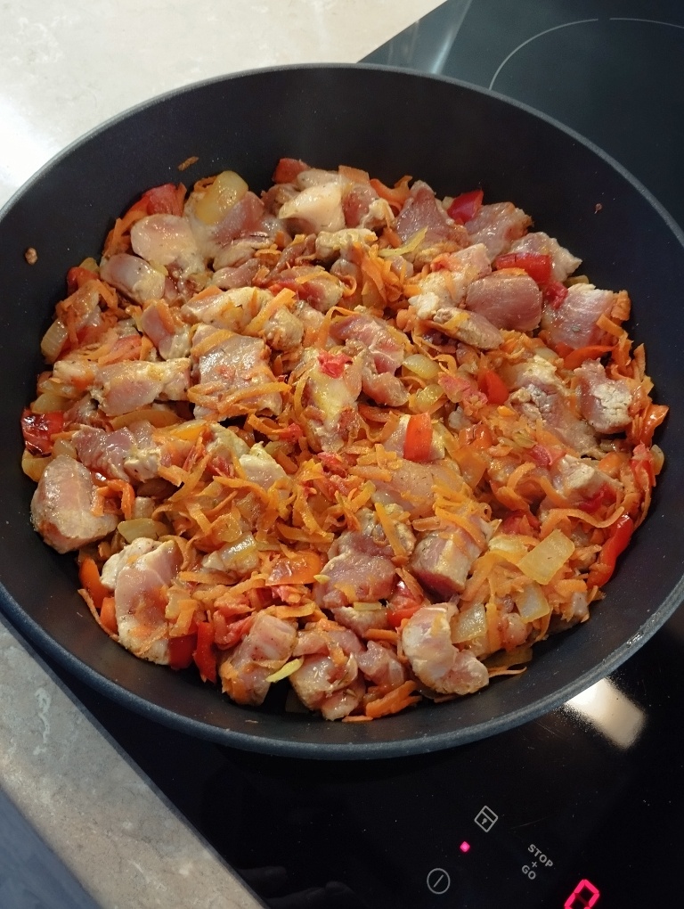 Сегодня была ужасная погода, снег с дождем и холодно. Но мне нужно было сходить забрать свой заказ в пункте выдачи в торговом центре. Я вернулась вся замерзшая, одежда и сумка были мокрые, а дома не было обеда, зато были начищены овощи и разморожено мясо. При готовке я использовала перец и помидор, замороженные летом, очень удобно. Быстро собрала обед, осталось лишь дождаться, пока все приготовится. В сковороде обжарила лук, добавила морковь, помидор и болгарский перец. Потом добавила мясо кубиками, соль и специи по вкусу. Когда мясо побелело, я добавила немного воды и оставила тушиться под крышкой на 50 минут. Для гарнира я использовала мультиварку. Нарезанный картофель положила в чашу. На него добавила сметану и сливочное масло, потом немного воды, соль и специи. Добавила ложку вустеширского соуса. Выбрала программу тушение и тоже выставила время 50 минут. Осталось подождать и вот обед готов. Получилось вкусно, сытно и ароматно.
