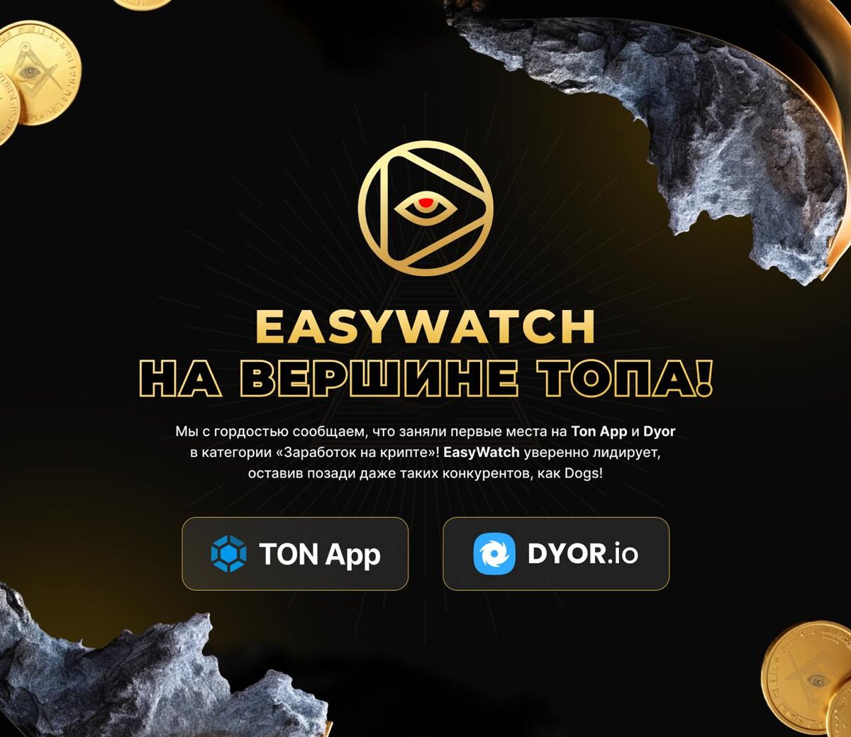 🥇 EasyWatch на вершине ТОПа! Мы с гордостью сообщаем, что заняли первые места на Ton App и Dyor в категории «Заработок на крипте»! EasyWatch уверенно лидирует, оставив позади даже таких конкурентов, как Dogs! 💪 Это ваша заслуга, друзья! Мы продолжаем развиваться, а вместе с нами растут ваши возможности для заработка. Будьте с нами на вершине и готовьтесь к еще большим достижениям! Следите за новостями – впереди много интересного! 👁 ПРИЛОЖЕНИЕ EASYWATCH После перехода по ссылке, вы попадаете в бота, где нужно нажать кнопку «Начать зарабатывать» и приложение запустится.
