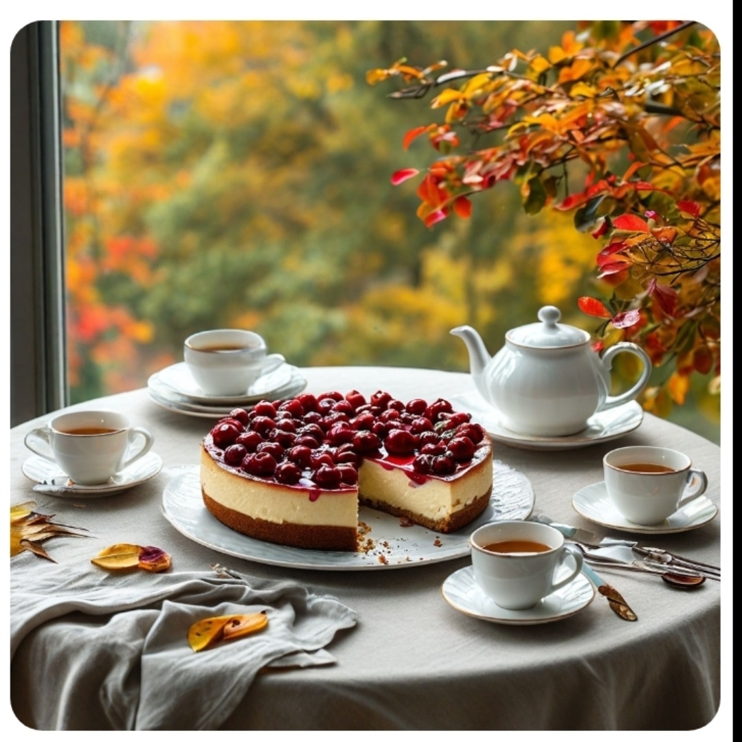 Осень вступила в свои права. Дружная семья решила, как обычно, провести выходные вместе. Они собрались за столом, на котором стоял большой аппетитный круглый вишневый чизкейк, приготовленный мамой и дочкой совместно. Все они любили пить чай из форфоровых белых чашек с маленькими ложечками, наслаждаясь его ароматом и вкусом чизкейка. Осенний парк с красной рябиной добавлял уюта и тепла в атмосферу дома. Семья обсуждала планы на выходные, которые они хотели бы провести вместе. Они мечтали о том, чтобы провести их на свежем воздухе, погулять по парку и насладиться красотой осени. А после приятного чаепития, семья перейдёт в комнату, где за большим столом они будут играть в настольные игры, радуясь, выигрывая, и огорчаясь, проигрывая. Но у всех будет хорошее настроение, ведь они проводят время весело и спокойно. И дети опять заведут речь о том, как бы им хотелось иметь собаку. Они ведь уже говорят о ней несколько месяцев. Но родители все не решаются дать свое согласие. Уютны