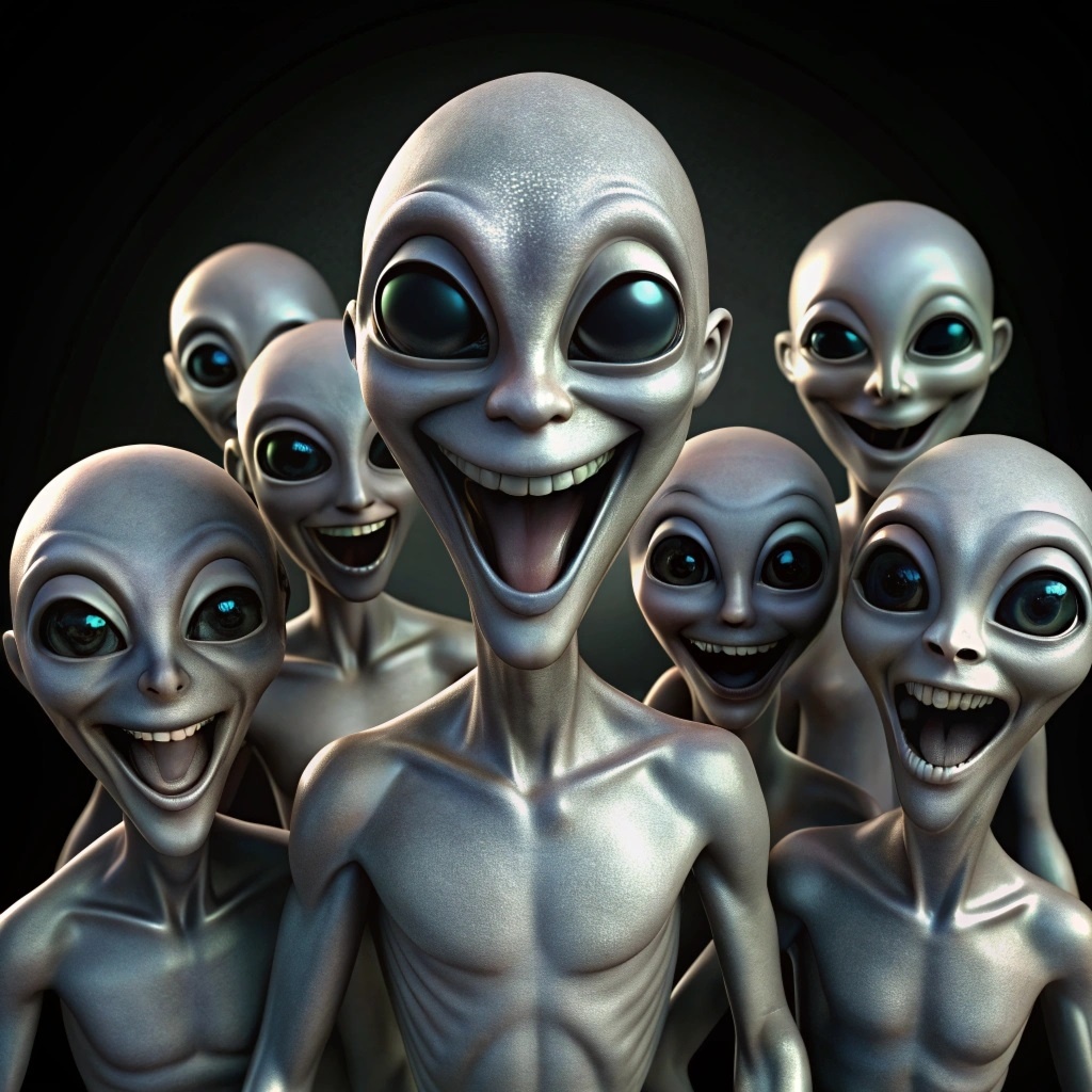 Пришельцы постепенно опять собрались возле тарелки, один из них трясся, издавая странные звуки, похожие на смех. Потом другие тоже стали издавать такие же звуки, но менее экспрессивно.