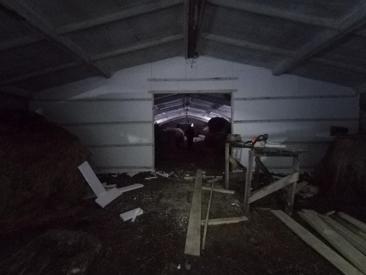 20 ноября. Утром нас с Русланом снова везут в Копейкино. Снова предстоит стучать молотком по гвоздям и таскать доски. Это хорошо! Хорошо когда не сидишь просто так дома, а занимаешься какими-нибудь делами. Тем более такими важными, как обустройство льнозавода. Наша стена, за два дня пока меня не было, утеплилась пенопластом. Руслан работал эти дни один. Он за это время успел закрыть пару ненужных окон, пропенить дыры и щели в стенах фермы и утеплил нашу стену. Теперь у стены валяются белые ненужные куски пенопласта и обрезки досок. Сразу видно: "Ведутся строительные работы." 😊 Колотим стену доской. Точнее, я колочу, а Руслан отмеряет и отпиливает нужного размера доски. Работа вроде лёгкая, но разные размеры досок и необходимость каждый раз лезть по лестнице чтоб забить верхний гвоздь, делают нашу работу долгой и утомительной. До обеда мы успели доколотить одну сторону стены. Теперь можно приниматься за каркас ворот. Ворота будут деревянными с каркасом из бруса, утеплением