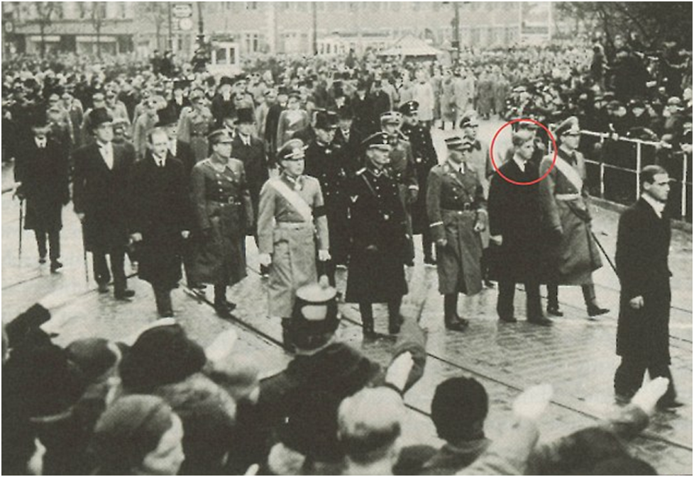 По обе стороны от молодого принца стоят скорбящие родственники, все в характерной нацистской форме. Один из них одет в форму «коричневых рубашек», другой — в полном обмундировании СС. На улице в Дармштадте, недалеко от Франкфурта, толпятся люди, многие из которых приветствуют друг друга словами «Хайль Гитлер».
