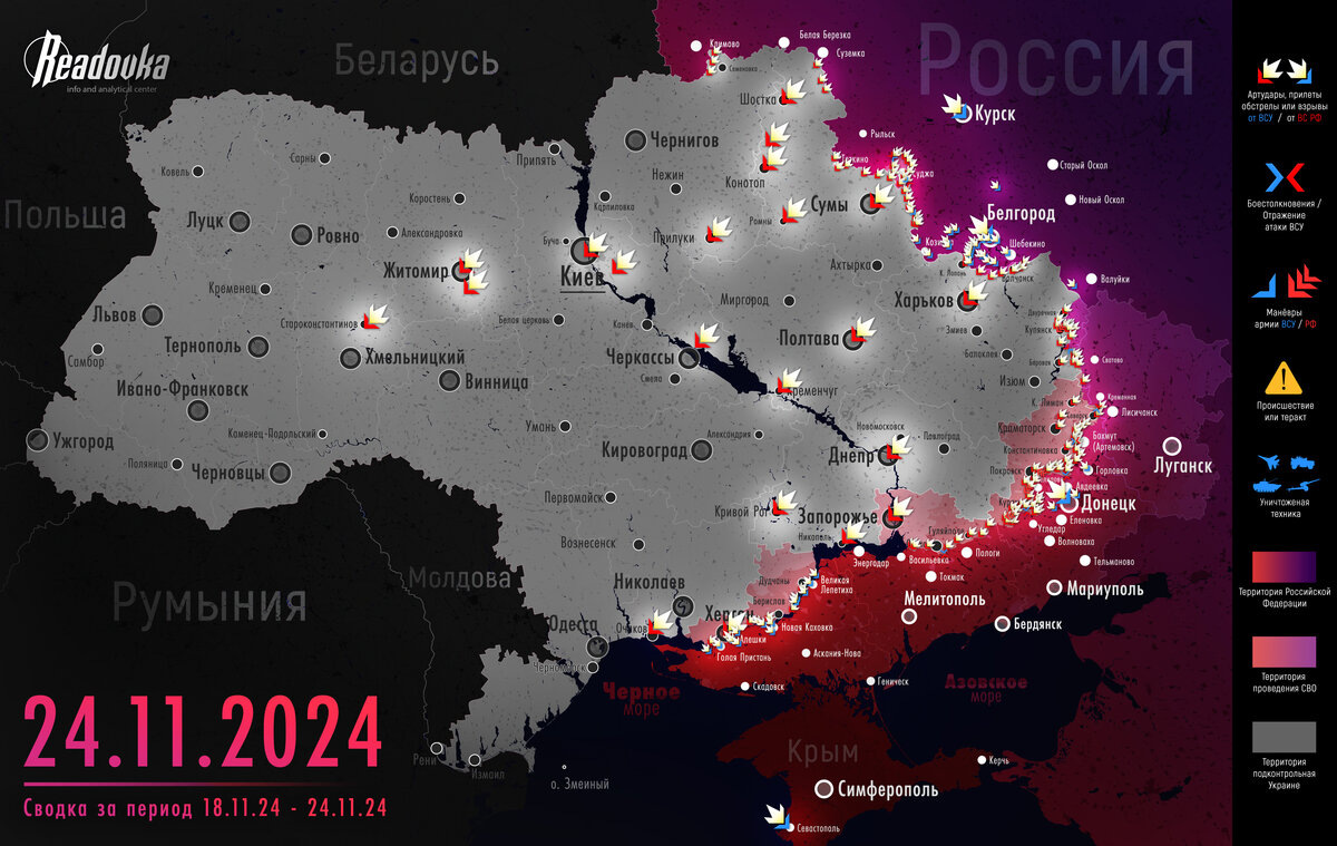 Главным событием уходящей недели стало первое применение ВС РФ новой баллистической ракеты «Орешник» по заводу «Южмаш» в Днепропетровске. Демонстрационный удар стал ответом на попытки Киева атаковать Курскую и Брянскую области с помощью западного дальнобойного вооружения. Визит Зеленского в Купянск инициировал серию украинских контратак, однако они не смогли остановить дальнейшее продвижение ВС РФ, а лишь увеличили потери ВСУ. В Часовом Яре русские бойцы инициировали схватку за ключевую точку обороны противника в огнеупорном комбинате, которая разделяет город на 2 части. Наши штурмовики пересекли на лодках Кураховское водохранилище и взяли под контроль элеватор, относительно слабое сопротивление неприятеля подтверждает факт подготовки отхода подразделений ВСУ из города. ВС РФ вышли на дистанцию в 1 км до Великой Новоселки. В США признали, что использование Украиной дальнобойного вооружения не сможет изменить текущего расклада сил, а в России анонсировали запуск серийного производства «Орешника». Обо всем этом по порядку и в подробностях – в итоговой сводке Readovka..