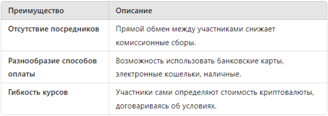 P2P (Peer-to-Peer) торговля криптовалютой — это способ обмена цифровыми активами между участниками без посредников, таких как биржи. В отличие от традиционного трейдинга, где пользователи взаимодействуют с централизованной платформой, в P2P сделках участники сами договариваются об условиях обмена. Этот способ привлекает внимание как начинающих, так и опытных инвесторов благодаря простоте и возможности снизить транзакционные издержки. Давайте разберемся, как работает P2P торговля, её особенности и преимущества. P2P платформы предоставляют площадку, где продавцы и покупатели криптовалюты могут размещать объявления. Сделки могут включать популярные криптовалюты, такие как Bitcoin (BTC), Ethereum (ETH) или токены на базе блокчейна. Алгоритм взаимодействия выглядит следующим образом: Пример: