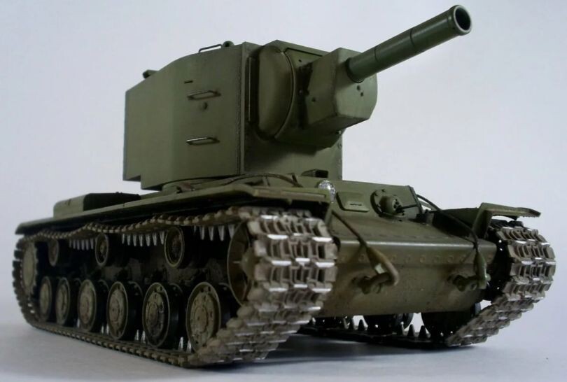 КВ-2 — советский тяжёлый штурмовой танк начального периода Великой Отечественной войны. 1 Аббревиатура КВ означает «Клим Ворошилов» — официальное название серийных советских тяжёлых танков выпуска 1939–1943 годов, названных в честь героя Гражданской войны в России, военного и политического деятеля Ворошилова Климента Ефремовича. Эта боевая машина была разработана конструкторским бюро Ленинградского Кировского завода (ЛКЗ) в январе 1940 года в связи с необходимостью Рабоче-крестьянской Красной армии (РККА) в хорошо защищённом танке с мощным вооружением для борьбы с фортификациями линии Маннергейма во время советско-финской войны 1939–1940 годов. КВ-2 имел 152-мм калибр штатной танковой пушки, снаряд которого мог пробить броню любого вражеского танка. Экипаж танка составлял 6 человек, 4 из которых располагались в огромной башне. Вот его фото.