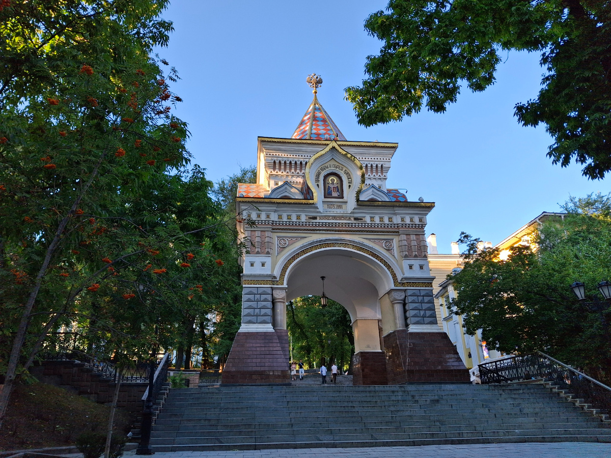 Сверху в полуарке - образ Николая Чудотворца. Вид с обратной стороны. Герб Владивостока и год основания города - 1880. Пора возвращаться в отель. Вид назад. Адмиральской сквер. Нептун. Скульптура «Элеонора Лорд Прей» — это памятник "американской гражданке, которая жила во Владивостоке с 1894 по 1930 год и описала жизнь города в своих письмах к родственникам в США и Китай". Фото по пути. Вернулись в отель. Вид из окна номера. Солнце садится. Закончился день.