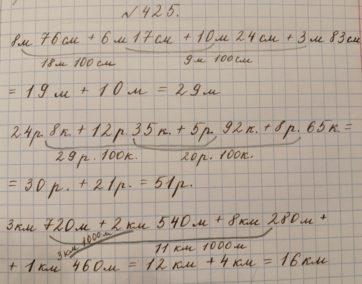 1. Проверка домашнего задания. Один ученик записывает решение задачи 423, остальные учащиеся сверяют ответы примера 421(3). 2. Объявление темы урока. Сегодня мы будем повторять вычитание именованных чисел и работать самостоятельно. 3. Работа по теме урока. N 425. Используя сочетательных закон сложения, решим примеры устно с записью на доске: Вместе решим две задачи. N 426(1). N 427. Теперь поработаем самостоятельно. N 426(3,4) N 421(2) 4. Домашнее задание. N428.