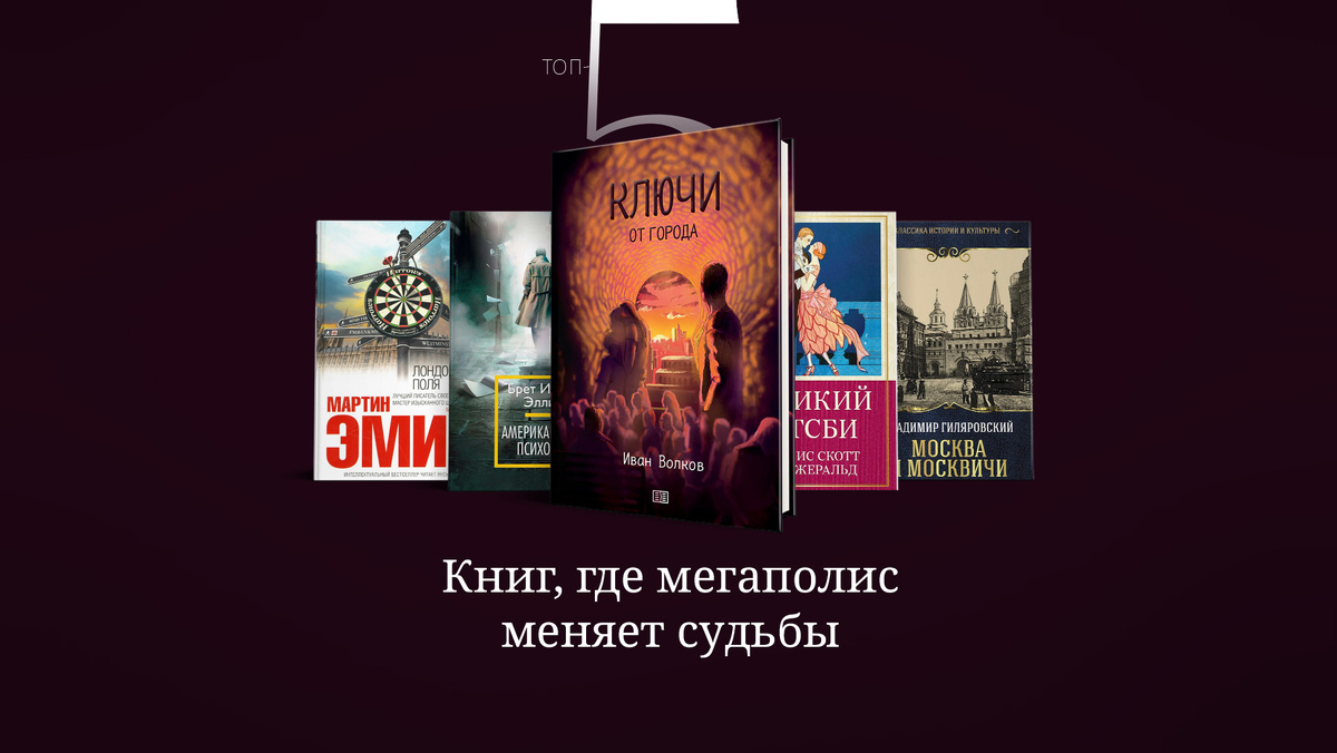 «Ключи от города» Иван Волков Это история молодого человека, чья жизнь кардинально меняется на фоне трагически утраченной любви. Главный герой погружается в мир афер и моральных компромиссов, проходя через внутреннюю борьбу и трудные выборы. Это роман о взрослении, падениях и поиске себя. «Великий Гэтсби» Ф. Скотт Фицджеральд История Джея Гэтсби, человека, который пытается вернуть прошлую любовь в бурлящем Нью-Йорке. Город становится символом как роскоши, так и разочарования, а стремление к мечте ведёт к разрушению. «Американский психопат» Брет Истон Эллис Нью-Йорк 1980-х: Патрик Бейтман — успешный брокер, за внешним блеском которого скрывается жестокий психопат. Этот роман — жестокая сатира на потребительскую культуру и равнодушие мегаполиса. «Москва и москвичи» Владимир Гиляровский Книга о дореволюционной Москве, её обитателях, забавных и трагичных историях, которые вбирает в себя город. Живая хроника столичной жизни от знаменитого писателя и журналиста. «Лондонские поля» Мартин Эми