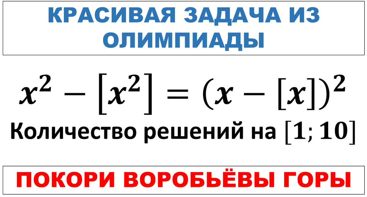 Разберём сегодня одну шикарную задачу по математике из отборочного тура олимпиады Покори Воробьёвы Горы, к которой я ежегодно готовлю своих учеников. Уж очень она мне понравилась. Давайте прочитаем условие. Целой частью числа x (обозначение [x]) называют наибольшее целое, не превосходящее x. Например, [3.14] = 3, [2024] = 2024. Сколько решений имеет уравнение x^2-[x^2]=(x-[x])^2 на отрезке 1<=x<=10? И так далее до интервала (9;10). При подборе дробной части значений x использовали то, что знаменатель дробей должен быть равен 2[x], чтобы он сократился, а числитель - целому числу от 1 до 2[x]-1. Тогда в общем виде дробные значения x, при которых 2x[x] принимает целые значения, можно записать так: Докажем, что все они являются решениями исходного уравнения: Тогда общее количество решений на отрезке [1;10] равно: 1+3+...+17+10 = 91. Более подробный разбор смотрите в видео на канале: Вот такая красивая задача. Я сам, как репетитор по математике и физике, готовлю школьников к олимпиадам. Та
