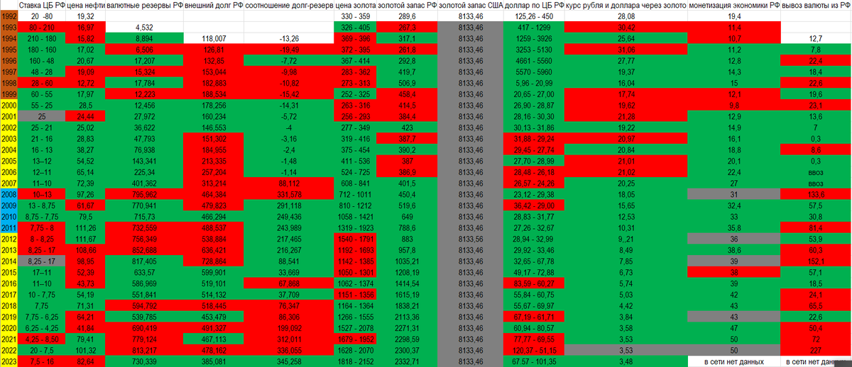 Фундаментальные показатели экономики РФ 1992 - 2023 годы, таблица.