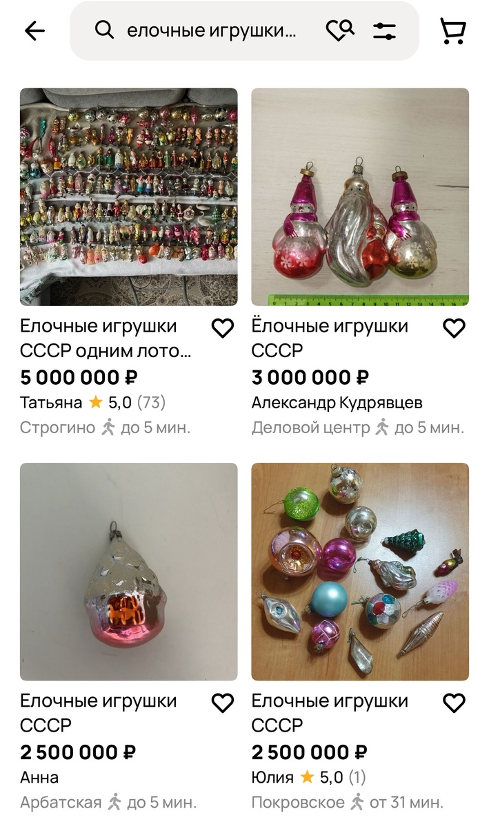 Увидела я тут новость в одной из соцсетей, что на Авито сейчас продают новогодние игрушки по цене квартиры. Решила сама это проверить. Зашла на Авито, вбила «елочные игрушки» и стала смотреть. И правда, не обманывают, таких предложений много. И по цене квартиры, и по цене машины. Мне стало очень интересно, на что еще идут люди, чтобы обогатиться и я пошла искать дальше. Я даже нашла Дедов Морозов. Первый меня уж очень заинтересовал своей ценой. Сначала по фото подумала, что он размером в человеческий рост (тогда я бы еще поняла откуда такая цена), но по описанию оказалось, что ростом всего с полугодовалого ребенка — 60 см, а цена, как маленькая студия в Москве. И неужели кто-то действительно его купит за такую сумму? Какой-то коллекционер раритетных игрушек? Ну раз предложений много — значит и спрос есть. Понимаю, что у это воспоминания из детства, но мне кажется цены, которые я показала на фото выше, просто нереальные. Я вам свои игрушки, которые мы заказали на этот Новый год покажу п