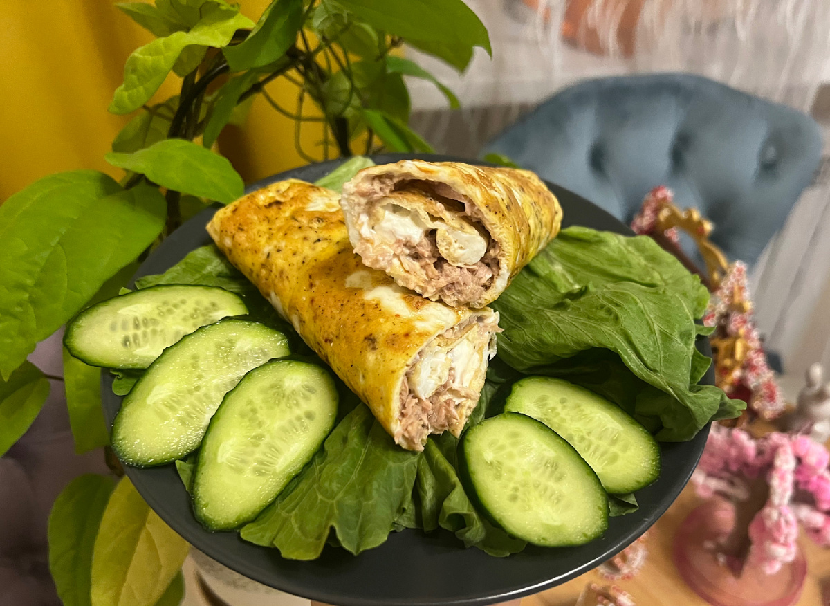 Экспресс завтрак - яичный ролл с тунцом. Ингредиенты: Приготовление: *тунец в собственном соку. Яйца взболтать со специями. Выпекаем на сковороде яичный блинчик. Намазываем блинчик твороженным сыром и выкладываем салат и тунец. Сворачиваем в ролл. Можно огурец добавить в сам ролл, но тогда будет не очень удобно сворачивать. Приятного аппетита!