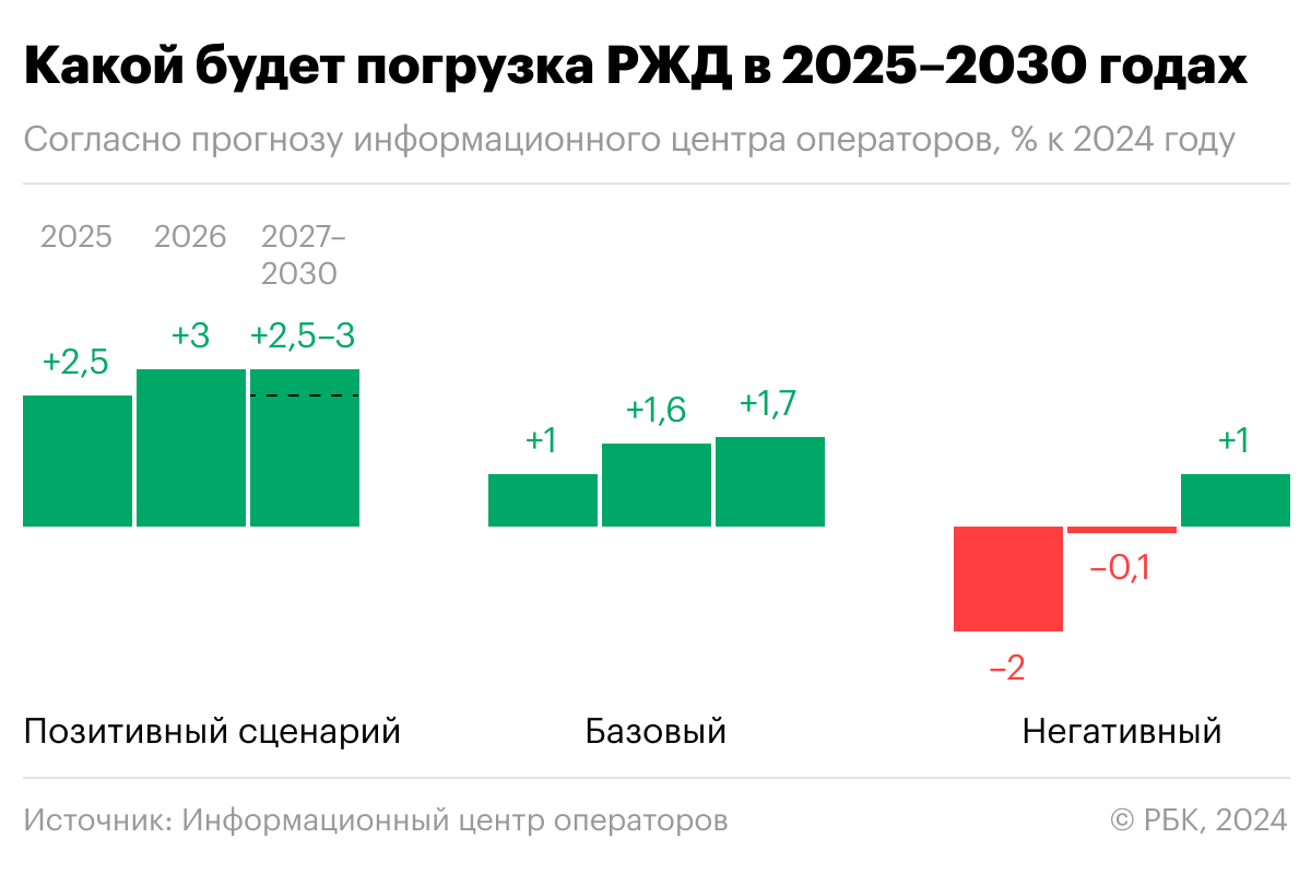 В 2025 году погрузка на сети РЖД, в соответствии с базовым сценарием, вырастет примерно на 1%, подсчитали в Информационном центре операторов (ИЦО): «Ограничивающими факторами» выступят санкционное давление, цены на российскую продукцию на внешних рынках, замедление темпов экономики, высокий оборот вагона (время от погрузки до следующей погрузки; рост показателя продолжится, его темпы снизятся и составят менее 4% против 6% в 2024-м)».