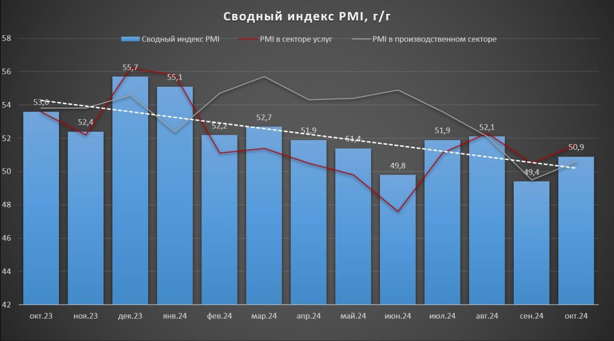 Опросы собственников компаний, закупка сырья, товаров для перепродажи, коммерческого транспорта, реальные инвестиции в бизнес являются хорошими опережающими индикаторами будущего положения дел в экономике и на финансовых рынках. Ниже оценка активности российских компаний за октябрь - ноябрь 2024 года. Деловые настроения российских компаний в ноябре по-прежнему оставляют желать лучшего. Опросный индекс PMI composite находится ниже прошлого года и ниже отметок с начала года. ▪️Год к году: 50,9 октябрь 2024 vs 53,6 октябрь 2023 г. ▪️С начала года: 50,9 октябрь vs 55,1 январь. Индикатор бизнес климата (ИБК) в ноябре продолжает снижаться относительно прошлого года. С начала года динамика так же нисходящая. Сравнивать цифры месяц к месяцу не вижу смысла, т.к. они очень волатильны и изменчивы, годовая динамика более показательна. ▪️5,5 п. ноябрь 2024 vs 6,9 п. ноябрь 2023 г./ 7,0 п. январь 2024 Снижаются как оценки текущего положения дел, так и ожидания на ближайшую перспективу. Количес