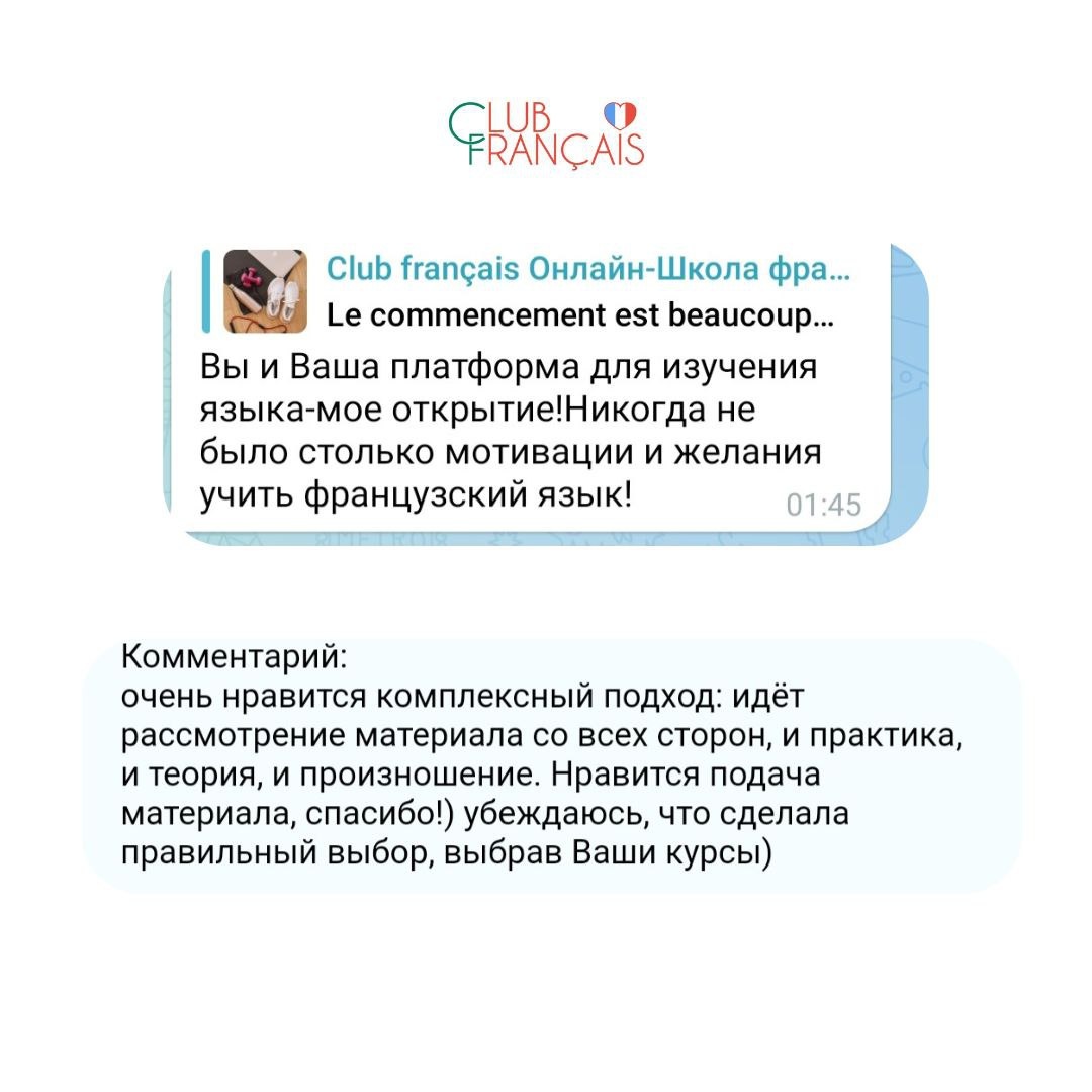 🌟 практической части В рамках практической части вы выполняете упражнения разных форматов и тут же получаете обратную связь от бота. Благодаря ему вы сразу видите, где ошиблись, где ответили верно. После завершения урока, к вам на почту придет письмо с вашими результатами. Это очень удобный способ изучения французского по отработанной классной методике. Попробуйте сами. Тем более, скоро начнутся скидки до 70%:
