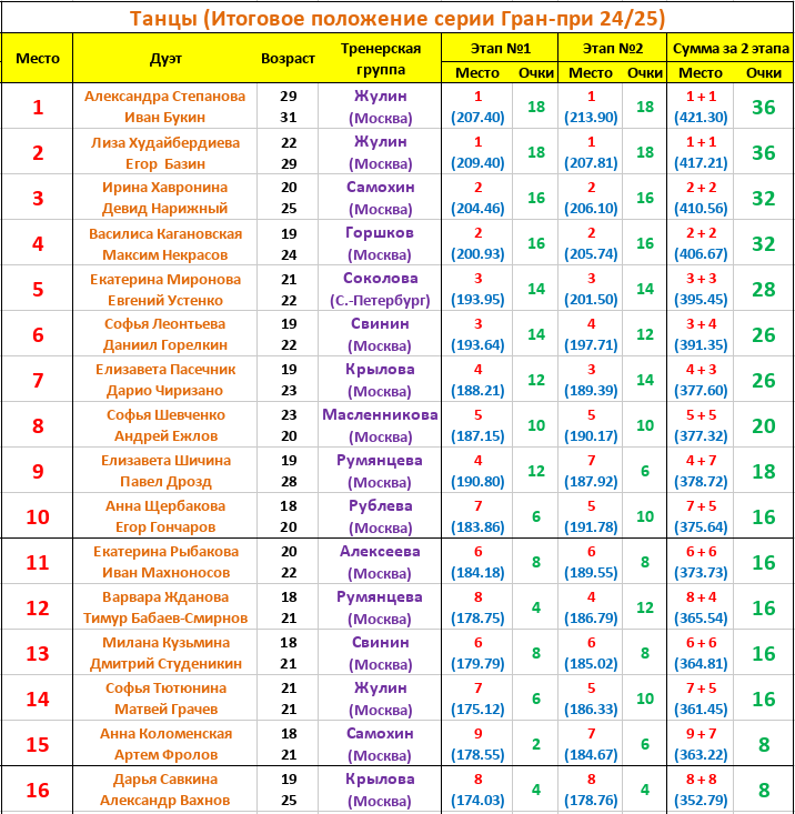Радует большое разнообразие школ. Топ-15 дуэтов-участников Чемпионата России 2025 представляют 10 тренерских групп, где в стройные московские ряды привычно протиснулась одна петербуржская пара. Кстати, состав Чемпионата России по сравнению с прошлым сезоном обновился в итоге почти на половину (7 новых дуэтов) и стал значительно сильнее. Если говорить о серии Гран-при, то ожидаемо все 4 этапа выиграли две лучшие танцевальные пары прошлого сезона, представляющие группу Александра Жулина.