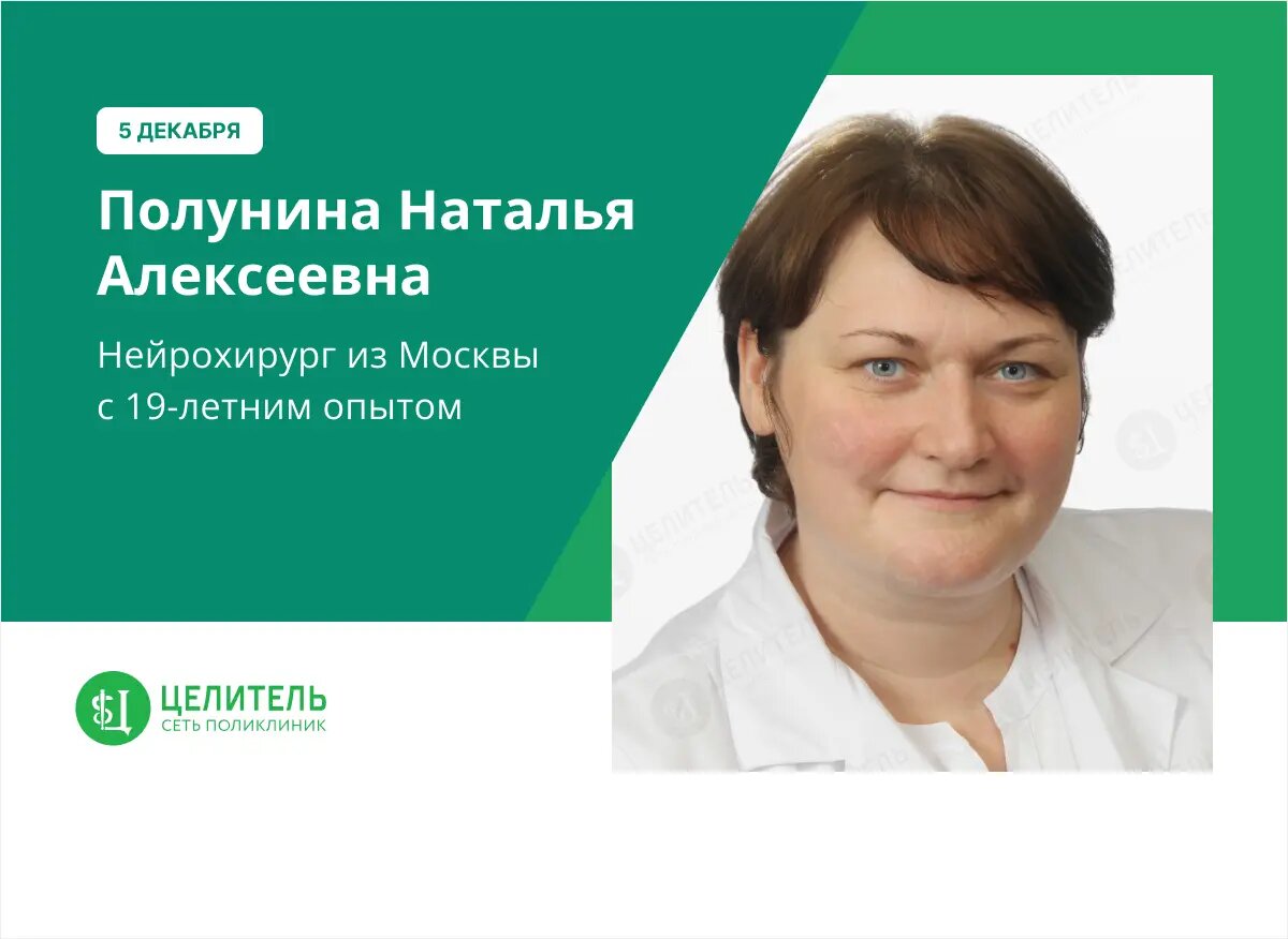 Уважаемые махачкалинцы и гости столицы! Специально для вас и только один день, 5 декабря в медицинской клинике "Целитель" в Махачкале состоится приём врача-нейрохирурга ММКЦ "Коммунарка" Департамента здравоохранения Москвы Натальи Алексеевны Полуниной. Наталья Алексеевна – член Российской и Европейской ассоциаций нейрохирургов, имеет учёную степень кандидата медицинских наук, является доцентом кафедры фундаментальной нейрохирургии РНИМУ им. Н. И. Пирогова, старшим научным сотрудником НИИ скорой помощи им. Н. В. Склифосовского, а также врачом-нейрохирургом всемирно известного многопрофильного медицинского центра "Коммунарка".; Специалист с богатым опытом работы и высокой квалификацией Полунина Н. А. готова помочь пациентам с заболеваниями нервной системы и предложить индивидуальный подход к каждому случаю по следующим направлениям: Доктор Полунина Наталья Алексеевна успешно проводит самые сложные хирургические операции, в числе которых: Пациенты смогут получить консультацию, обсудить в
