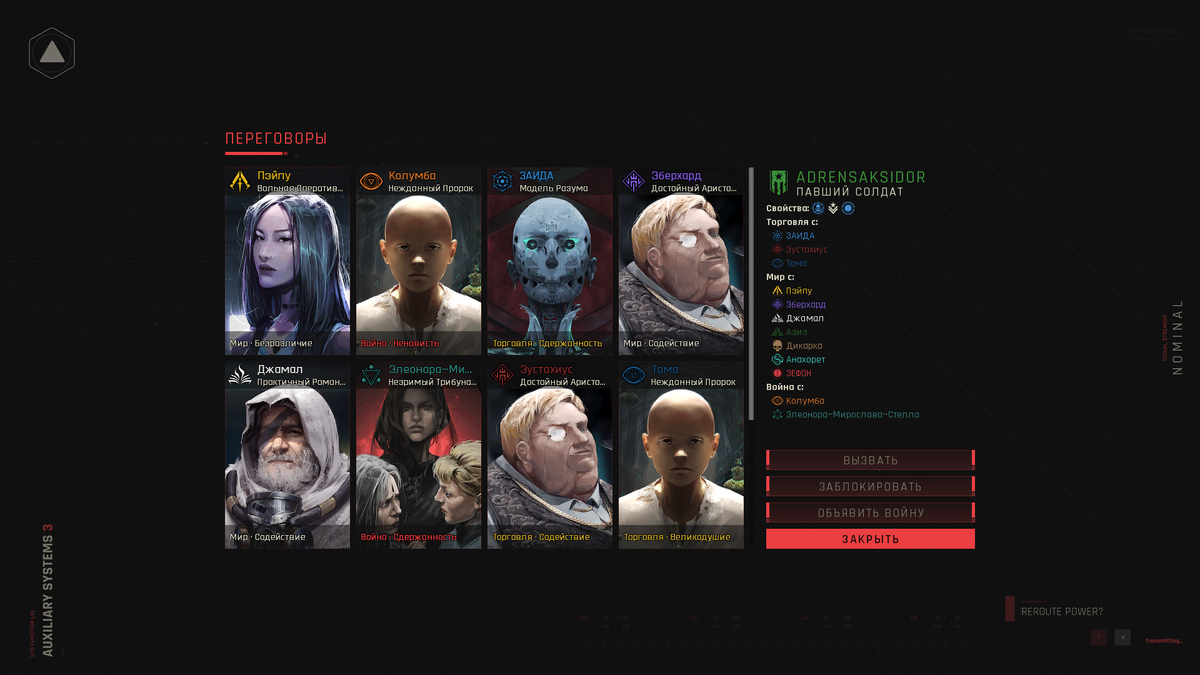 Кроме фракций восьми лидеров на карте присутствуют и три другие: местный рейдеры, пережившие войну на поверхности и теперь пытающиеся вытрясти деньги с тех, кто вышел из бункеров, остатки инопланетян, ищущие пути примирения с человечеством (акрины прилетели на Землю в полном составе и теперь находятся на грани уничтожения) и затаившийся Зефон. С этими тремя фракциями тоже можно вести переговоры, они обладают небольшим, но уникальным для себя ростером войск и активно пытаются друг друга снести, ну а после сотого хода (этот параметр можно настроить) акрины и Зефон начинают друг с другом войну на уничтожение, призывая на поле боя самые могущественные титанические отряды. Всем фракциям предлагает или поддержать одну из сторон, или воевать с обеими. В любом случае, для победы необходимо уничтожить вражеские титаны и не дать уничтожить союзные (пока не пробовал нейтральную сторону, не скажу, какие там условия победы). После чего игра заканчивается (при желании партию можно продолжить), игроку показывают текстовую концовку (зависит от лидера и выбранной стороны) и… предлагают задать вопрос по лору игры некой сущности (как я понимаю, воплощению Голоса). После чего можно начать новую партию, но с дополнительным модификатором, например, запретом на исследование технологий не своего пути, переманиванием юнитов с обнулившимся боевым духом или повышенными штрафами за нарушение договоров. Модификаторов в районе десятка, вопрос в конце партии можно задать только один, но сама идея постепенно раскрывать лор игры в 4Xстратегии в качестве награды за завершение партии (благо, они здесь не слишком продолжительные) выглядит интересно.