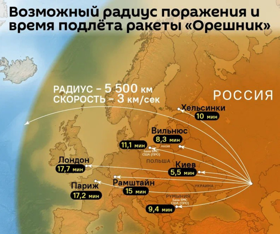 Практическое применение «Орешника» вызвало мелкую панику на Западе. Любопытно, что название данного изделия несколько нехарактерно для штуковин такого типа. Оно, скорее, ближе к ствольной артиллерии: «Гиацинт», «Акация», «Василёк»… У нас есть МБР «Воевода» (по-американски – «Сатана»), «Сармат», «Синева», «Булава» и другие. «Орешник» – изделие среднего радиуса действия (5500 км) с полётом по баллистической траектории и скоростью 3 км в секунду. Теоретически его, наверное, можно было бы образно сравнить с «Искандером», но это совсем некорректное сравнение, потому что скорость и дальнобойность другие. 10 –11 махов (скоростей звука) – это невообразимая скорость, такое изделие невозможно перехватить ничем. На Западе начали говорить, что «Орешников» у нас мало, и они старые. Но если они старые, то тогда их много успели понаклепать за предыдущие годы, просто не показывали, ибо незачем было. При этом, как показала наглядная демонстрация, они в прекрасном состоянии и великолепно летают. Если эт