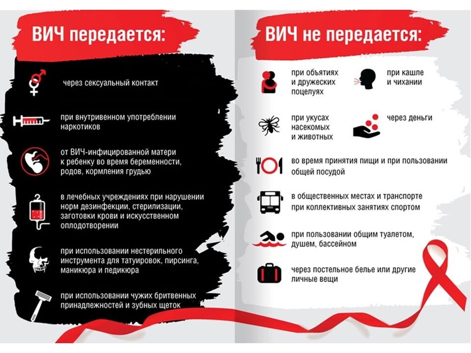 Как можно заразиться СПИДом? Конечно, заражаются не СПИДом (имунодефицитом), а вызывающим его вирусом (ВИЧ). Чтобы заразить человека, ВИЧ должен передаться ему от другого, ранее зараженного человека. Это может произойти при половых контактах. Это самый распространенный и естественный путь передачи ВИЧ. Кроме того, заражение может произойти при проникновении крови, зараженной ВИЧ, во внутренние среды организма незараженного. Это происходит при переливании крови от зараженного ВИЧ донора, при уколах, которые делают иглами и шприцами, на которых осталась зараженная ВИЧ кровь. Зараженная кровь чаще всего остается на иглах и шприцах, которыми пользуются наркопотребители. Известны случаи, когда подобное происходило и в больницах, если медики не соблюдали правил предосторожности. Наконец, ВИЧ может передаться от зараженной беременной женщины ее будущему ребенку, если женщина не принимает терапию. Другими путями ВИЧ не передается Может ли ВИЧ существовать в воздухе? ВИЧ по воздуху не летает. Н