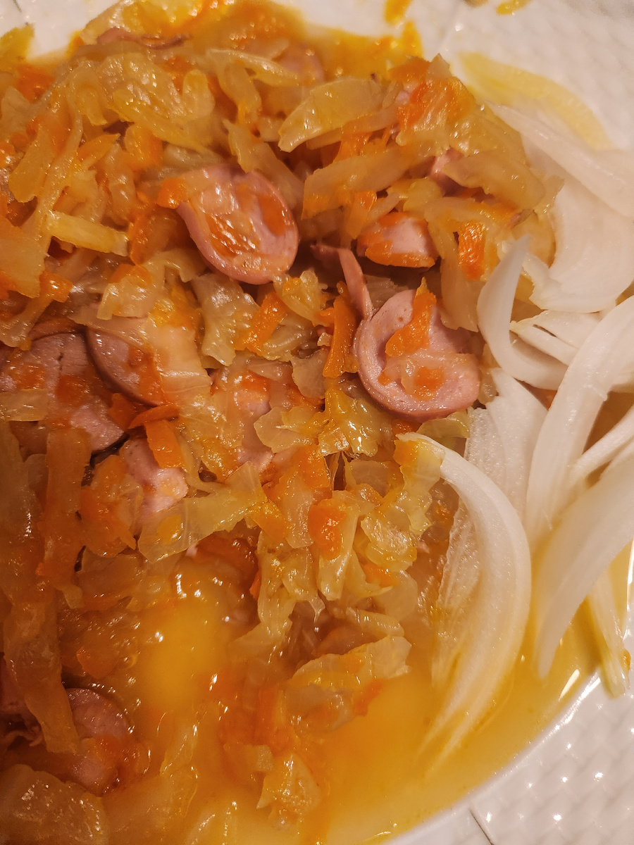 Добрый день, мои дорогие читатели. Когда мне нужно быстро и недорого накормить семью, я всегда вспоминаю про нее. Нам все время повторяют, что ужин должен быть лёгким, а это блюдо максимально удовлетворяет этому условию. В данной ситуации сколько людей, столько и способов приготовления тушеной капусты. Сама я готовлю ее не менее пятью разными способами. Но в моей семье этот является самым любимым. Берем один килограмм белокочанной капусты, три большие луковицы (около 300 граммов), большую морковку (300 граммов). Наливаю в сотейник 4 столовые ложки растительного масла, режу лук четверть кольцами, добавляю чайную ложку сахара, немного соли. Тушу 5 минут. За это время натираю на терке морковь и добавляю ее к луку. Морковь тушится вместе с луком пока нарезаю соломкой капусту. Добавляю капусту, доливаю 150 мл воды и тушу до готовности. Пока овощи тушатся, беру три сосиски, режу их как можно тоньше (для этого хорошо бы их до конца не размораживать) и обжариваю их на сливочном ма