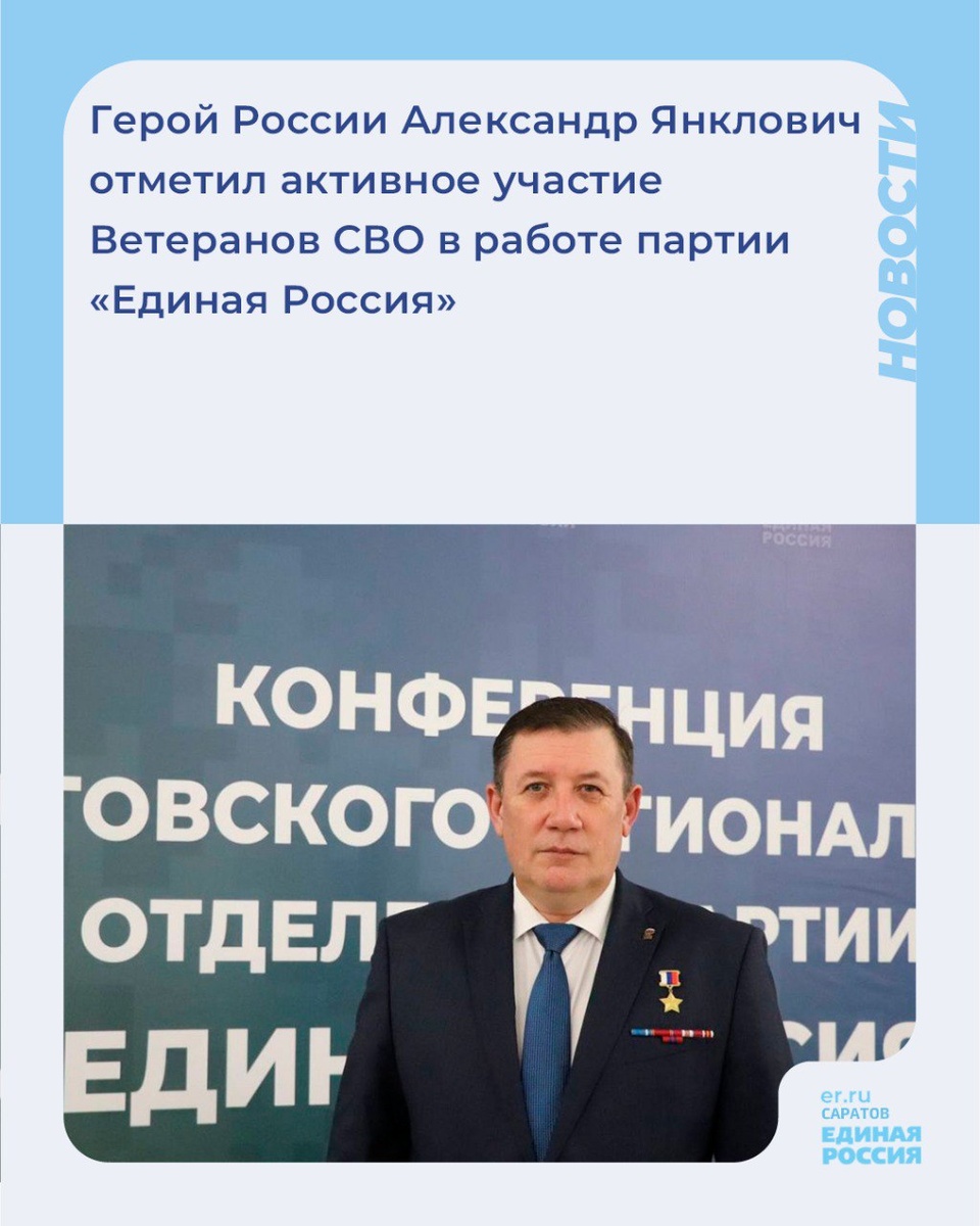 🎖️Депутат Саратовской областной Думы, Герой России Александр Янклович поделился мнением по поводу прошедшей региональной партийной конференции, рассказал об участии в жизни партии ветеранов СВО, многие из них стали членами регионального и местных политсоветов. 💬«Конференция Саратовского регионального отделения «Единой России» показала, что обновлять ряды Партии необходимо с учетом интересов общества. Сейчас главный запрос у людей, чтобы ребята, воющие на передовой с противником, их семьи были обеспечены всем необходимым. Ветераны специальной военной операции, мамы и жены наших погибших бойцов, как никто другой знает, что им нужно. Поэтому их нужно привлекать к работе в Партии. В моем избирательном округе - Волжском районе Саратова членами политсовета стали ветеран СВО Николай Власов и волонтер Дмитрий Молоков. В Ленинском районе Саратова новыми членами местного политсовета также были избраны участники СВО и представители их семей. В регионе, как уже озвучил Губернатор области Р