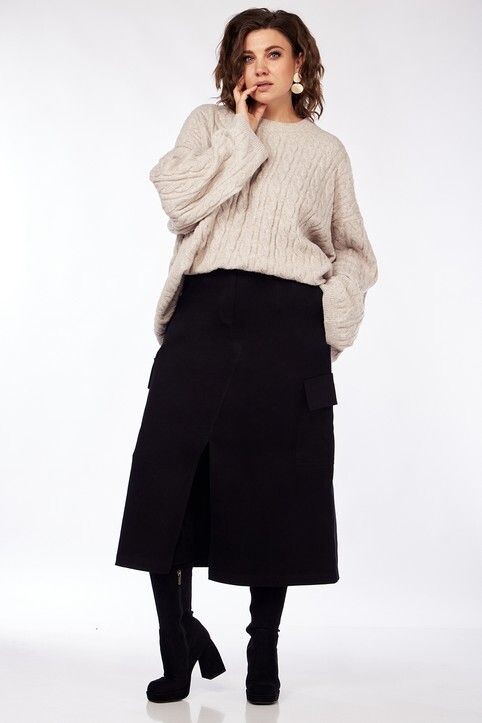 Хорошо выглядеть, ощущать себя привлекательной и выглядеть таковой в глазах других людей – о таком мечтает каждая женщина, и достичь этого она может в любом возрасте. Правильно подобранный гардероб способен творить чудеса – даже с самыми простыми и базовыми вещи можно составлять стильные комплекты, успешно играя с цветами, фактурами и фасонами. 1. Черная шерстяная юбка-миди А-силуэта с достаточно большим разрезом, начинающимся чуть выше колена, может стильно сочетаться с объемным светло-бежевым свитером с фактурной вязкой. Стильный образ получится, если переднюю часть свитера заправить за пояс юбки, подчеркнув талию, а дополнить наряд черными сапогами на высоком устойчивом каблуке. 2. Прямая лаконичная юбка-макси из джинсы с длинным разрезом по передней части в ансамбле с базовой футболкой с принтом-надписью – наряд достаточно простой и повседневный. А вместе с серым клетчатым жакетом классического кроя и черными лоферами на толстой подошве образ получается интересным и элегантным. 3.