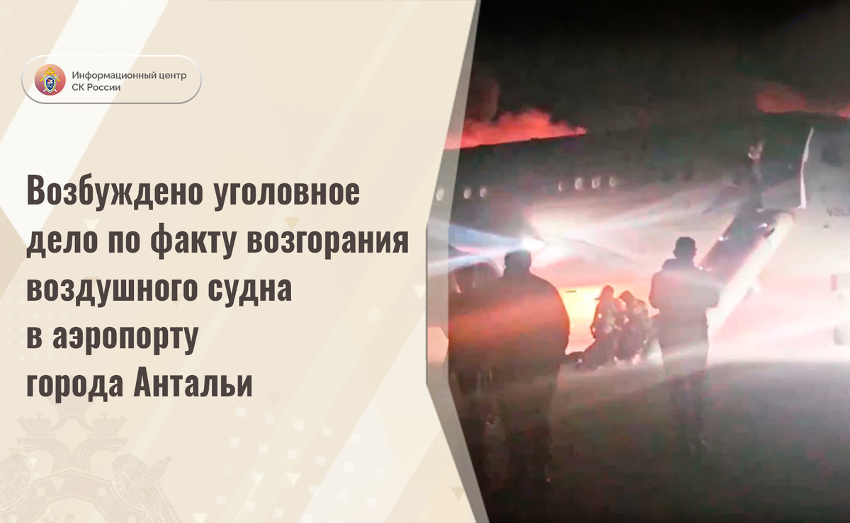 Возбуждено уголовное дело по факту возгорания воздушного судна в аэропорту города Антальи Западным межрегиональным СУ на транспорте Следственного комитета России по факту возгорания фюзеляжа воздушного судна возбуждено уголовное дело по признакам преступления, предусмотренного ч.1 ст.263 УК РФ (нарушение правил безопасности движения и эксплуатации воздушного транспорта). В ходе проведенных первоначальных следственных действий установлено, что 24 ноября 2024 года в международном аэропорту Анталья Турецкой Республики во время осуществления посадки произошло возгорание фюзеляжа воздушного судна, прибывшего рейсом из города Сочи. В результате данного происшествия никто не пострадал. Причиненный ущерб предварительно составил не менее 1 миллиона рублей. Следователями транспортного СК проведен осмотр места вылета в аэропорту Сочи, изъята необходимая документация, назначены судебные экспертизы, выполняется комплекс следственных действий, направленных на установление всех обстоятельств, причин