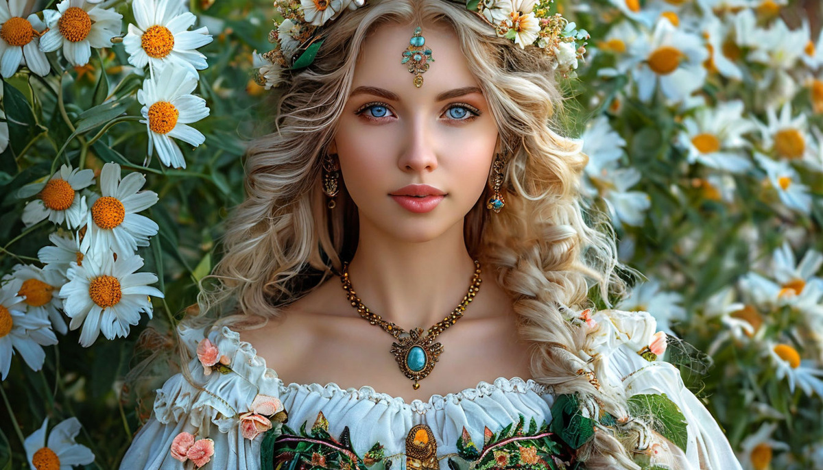Лада — одна из наиболее почитаемых богинь в славянской мифологии, связанная с весной, любовью, красотой и гармонией. Её культ символизирует обновление, плодородие и семейное счастье, делая её важной фигурой в представлениях о жизни и природе у славян. Лада изображается как прекрасная женщина с добрым и светлым лицом, облачённая в одежды зелёных и золотых оттенков, символизирующих весну, пробуждение природы и изобилие. Её венчает корона из весенних цветов, таких как ромашки или васильки. В руках она часто держит венок — символ любви и единства. Лада также ассоциируется с лебедями, которые считаются её священными птицами. Она покровительствует бракам и помогает семьям сохранить мир, любовь и гармонию. В её честь проводились весенние обряды, когда молодые девушки плели венки и просили у богини помощи в любви и удачного замужества. Лада считалась супругой Сварога, бога неба и света, а её дети также занимали важные места в мифологии: Эти связи делают Ладу богиней, объединяющей семейные узы,