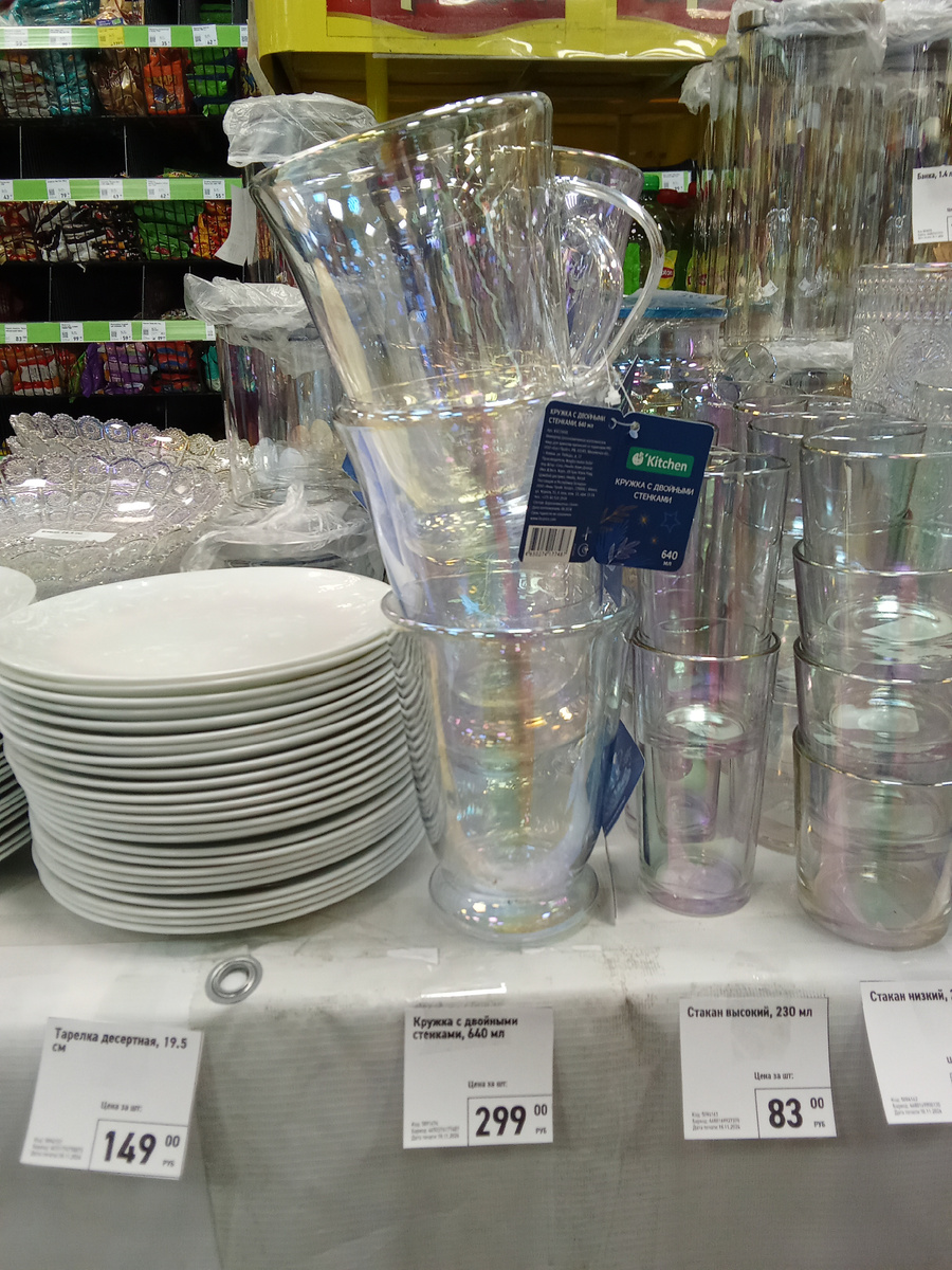 Кружки с двойным стеклом привезли. Повертела, покрутила в руках и вернула на место... Хороши, конечно, но как их приспособить?! Блюда под фрукты очень хороши, но мне покупать ничего нельзя Я в октябре схватила оранжевую банку-тыкву и три дня не знала, как ее приспособить и куда ее поставить. С трудом нашла ей место. Храню в ней сушеный боярышник... Салфетку на тыквенную тему купила и она мне нравится Обратила внимание на эмалированные кастрюли по 399р. Одна женщина две штуки схватила и на кассу Бульонницы с крышкой очень понравились. Если приобрести, то от чего-то из обихода придется избавиться. Места для хранения катастрофически мало на моей 5-метровой кухне Пиалы горчичного цвета хороши, но даже в руки брать боюсь. Вдруг приглянутся и обратно вернуть не смогу?! Кружки на фото получились не в фокусе. Хороши! Термобокалы очень симпатичные, но я только смотрю и бью себя по рукам... Стеклянные кувшины, конечно, интересные, но почему-то без ручки Зашла в Пятерочку, чтобы купить пару кило