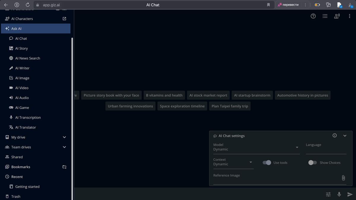 GizAI — это БЕСПЛАТНАЯ онлайн-платформа, объединяющая современные инструменты генеративного ИИ, встроенный AI-ассистент и функционал для работы с заметками и файлами. Сервис создан для того, чтобы упрощать рабочие процессы и помогать в создании текстов, изображений, и даже в решении повседневных задач. Работа с изображениями