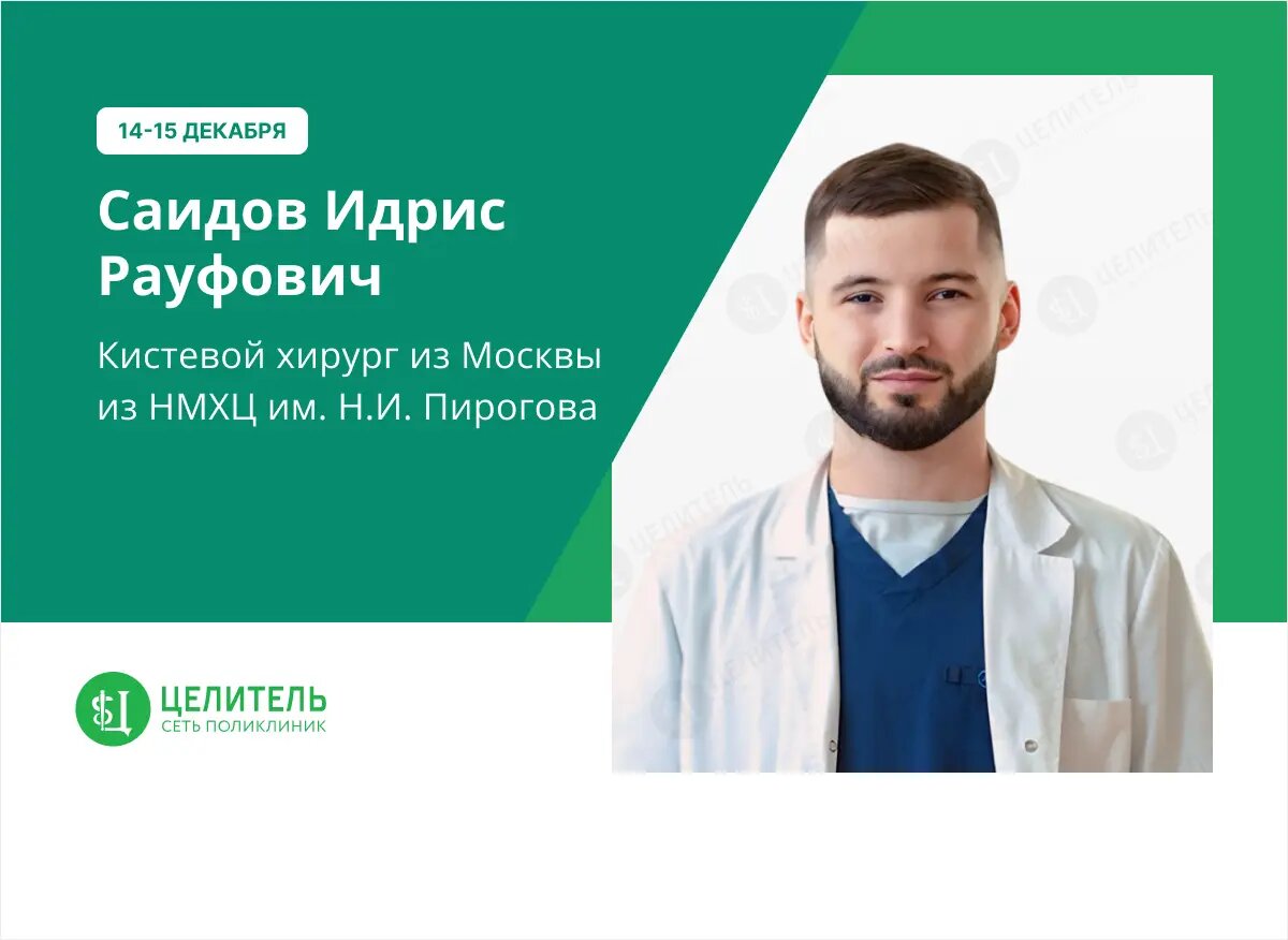 Вниманию жителей Махачкалы и гостей столицы республики! Только два дня, 14-15 декабря в нашем городе будет проводить консультационный приём, а также амбулаторное хирургическое лечение при возможности небольших операций на месте, специально приглашённый из Москвы ведущий специалист из всемирно известного Национального медико-хирургического центра имени Н. И. Пирогова врач – кистевой хирург Саидов Идрис Рауфович. Доктор Саидов И. Р. – высококвалифицированный специалист в области травматологии, ортопедии и кистевой хирургии. Он имеет богатый опыт работы в престижных московских клиниках. Успешно прошёл обучение и неоднократные курсы повышения квалификации в Военно-медицинской академии им. С. М. Кирова, в Российском научно-исследовательском институте травматологии и ортопедии им. Р.Р. Вредена и др. Идрис Рауфович проявляет особый интерес к изучению и применению на практике передовых методов лечения, включая минимально инвазивные хирургические техники. Поэтому его пациенты могут рассчитывать