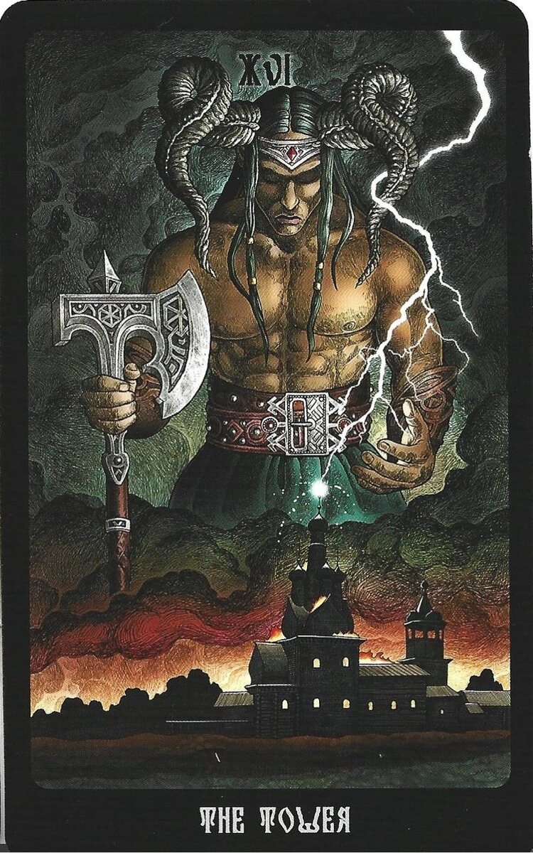 Как очнулся Перун, так отнес его Сварог в кузню, и Сварожичи ковали его тело день и ночь, пока не стало оно твёрдым, как металл. И тогда поднялся Перун и потребовал себе тяжёлый молот и коня буланого. И когда подали Перуну молот и коня, поднялся он на небо, и разорвало небо от удара молнии, и хлынул дождь. Перун — бог суровый и неумолимый. Он управляет дождями, громом и молниями и любит хорошую битву. Все воины молятся ему и преподносят жертвы, прося защиты и силы в сражении. Но там, где проходит Перун со своими воинами, остаётся боль и разрушения. Башня, в которую отправляет суровый Перун молнию свою, знаменует перемены. Перемены молниеносные и страшные, разрушение основания, самого фундамента. Башня — эта кара Перуна, которая следует за долгим и мучительным нагнетанием, это проявление его божественной воли, попрание Чернобога и очищение. Молния пронизывает Башню до основания, сжигая всё лживое, кривое и лишнее. И нет сил и смысла противиться этим изменениям, Перун слишком могуч и неу
