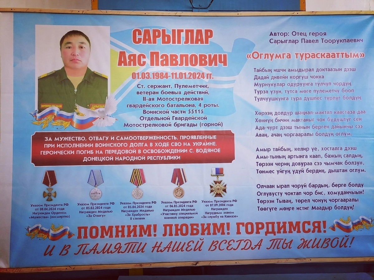 В селе Суг-Аксы в память о защитнике Отечества 10 ноября установили мемориальную доску и «Парту Героя». Аяс Сарыглар героически погиб, защищая мирное будущее страны. За участие в боевых действиях награждался медалями «За Отвагу», «За Храбрость». Посмертно награжден «Орденом Мужества» . На торжественном мероприятии присутствовали родные и близкие героя, учащиеся школы, учителя и одноклассники, официальные лица и социальный координатор Чойган Монгуш.