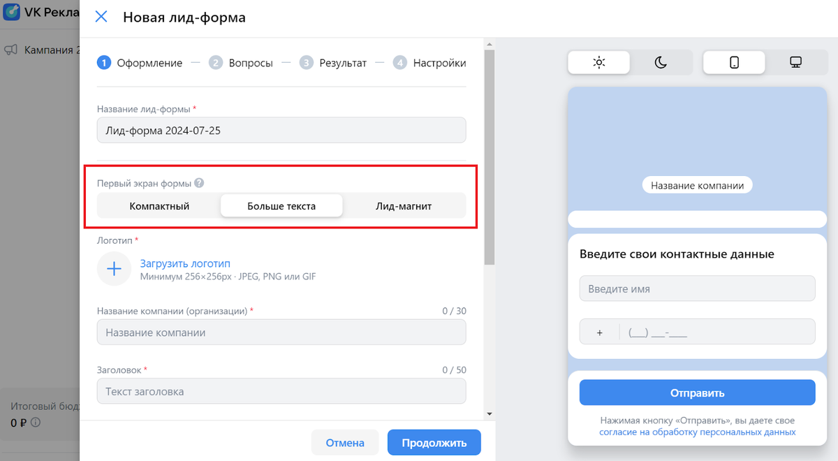 - Используйте вариант с длинным описанием. Для этого при создании лид-формы в рекламном кабинете выберите вариант «Больше текста».