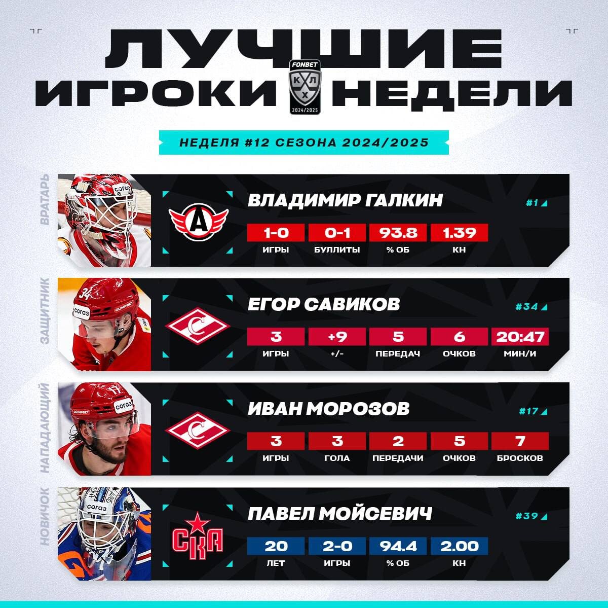 👉Лучшим вратарем стал Владимир Галкин (Автомобилист Екатеринбург ) его статистика бросков составила 93,8 % 👉Лучшим защитником признали Егора Савикова (Спартак Москва ) он провел три игры , показатель полезности +9 и отдал 5 голевых передач 👉Лучшим нападающим признан Иван Морозов (Спартак Москва ) он провел три игры , забросил три шайбы и отдал две результативные передачи 👉Лучшим новичком лига признала вратаря хоккейного клуба СКА , Павла Моисеевича . Он провел две игры и в обоих играх смог одержать победу . Его процент надежности составил 94.4% отраженных бросков . А коэффициент надежности (среднее количество пропущенных шайб за игру ) 2.0