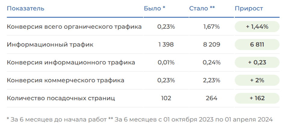Кроме увеличения трафика на коммерческие и инфо страницы, была подтянута конверсия, что в купе существенно увеличило количество лидов.