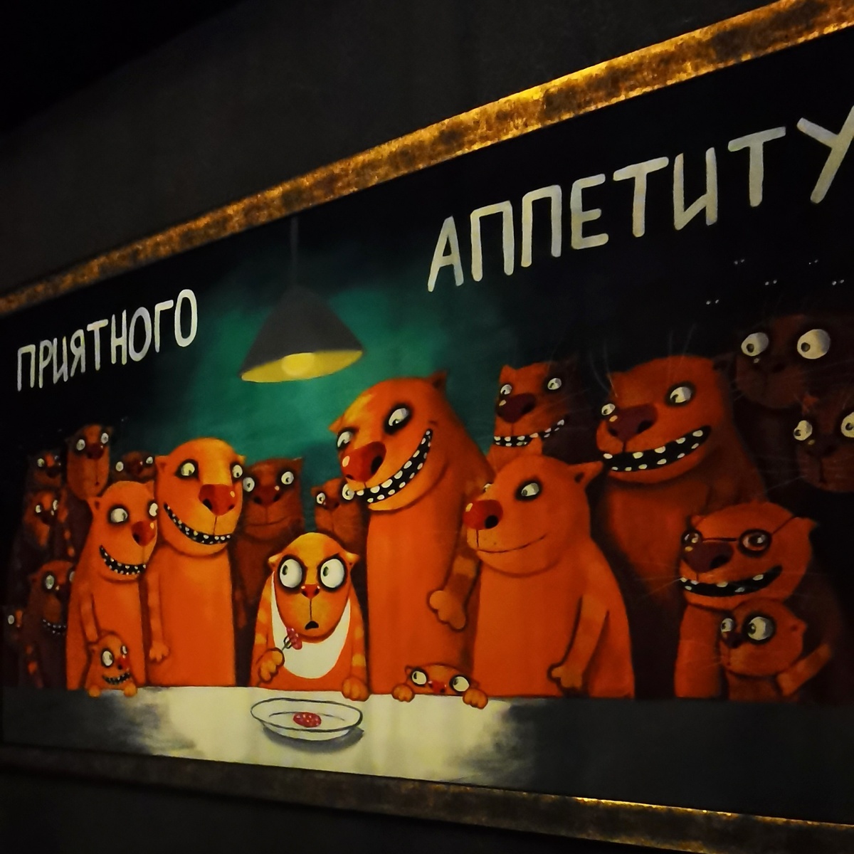 При входе встречает вовсе не модная силиконовая хостес, а одинокая вешалка под присмотром зубастых котов с картины Васи Ложкина. Сразу хочется колбаски и убежать.