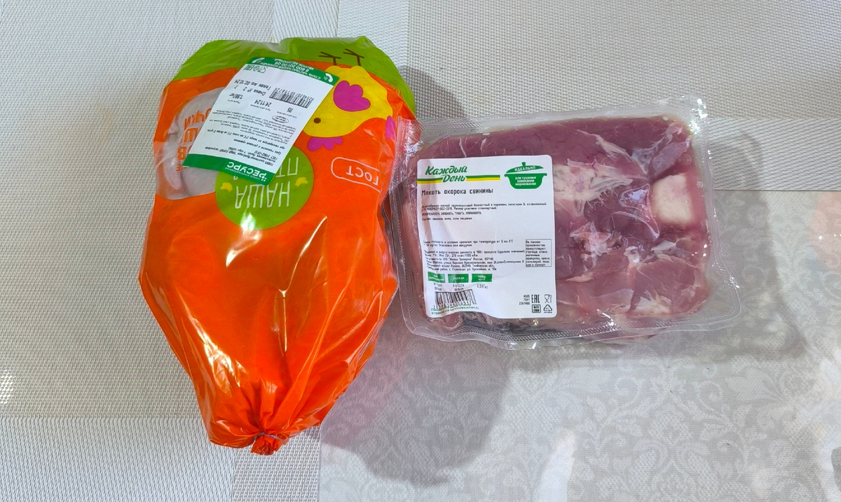 1. Свинина 940 грамм (мякоть окорока), 289 рублей.