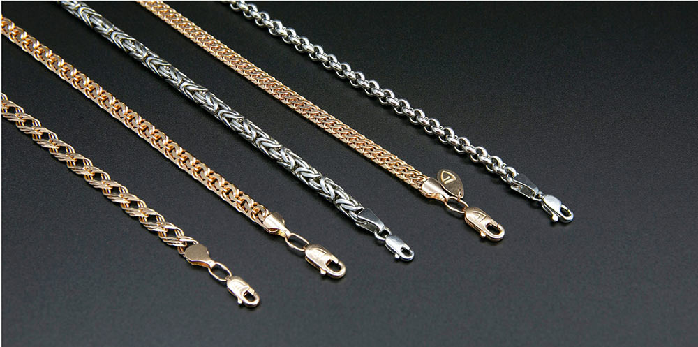 Часто встречается также панцирная цепь, когда звенья лежат ровно и декорированы алмазной гранью.
